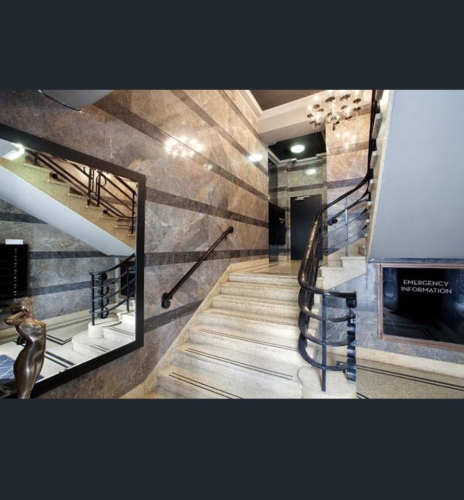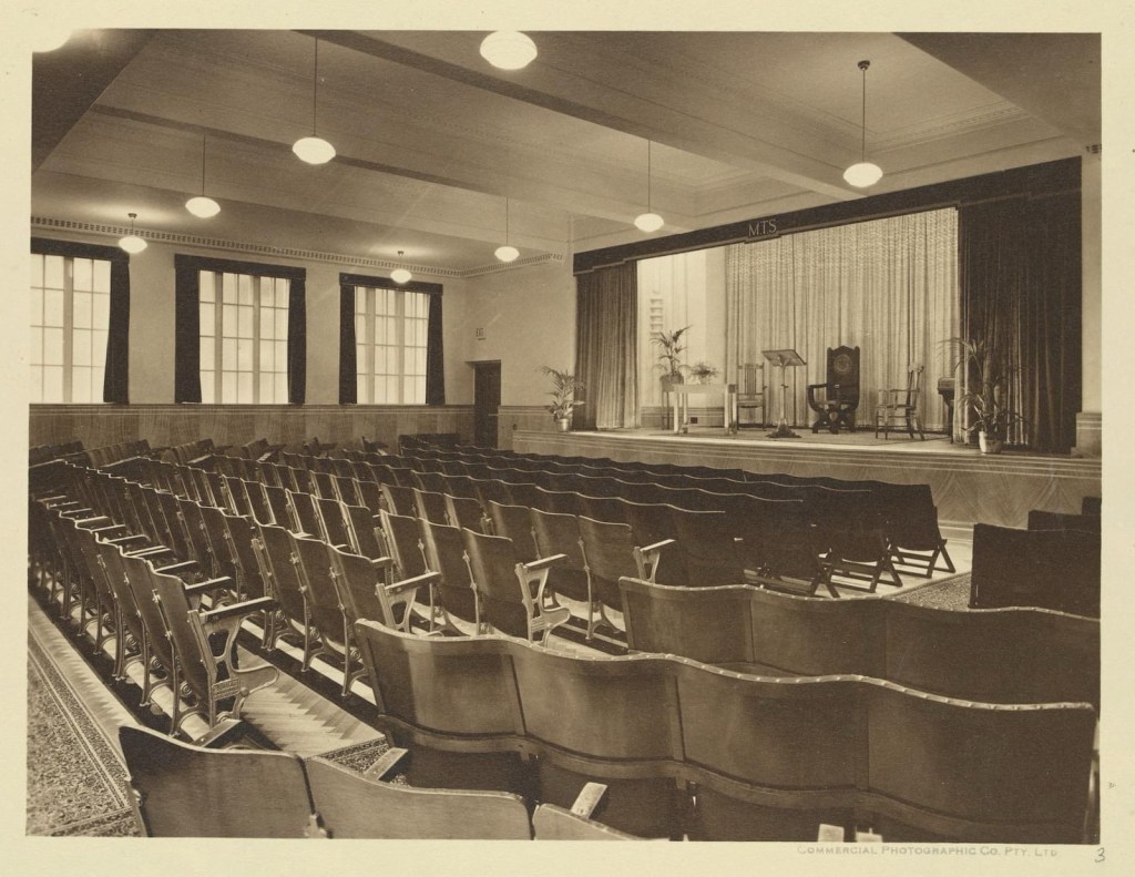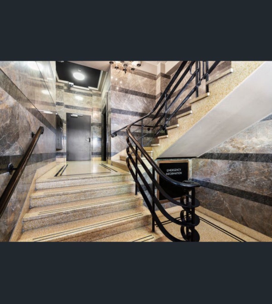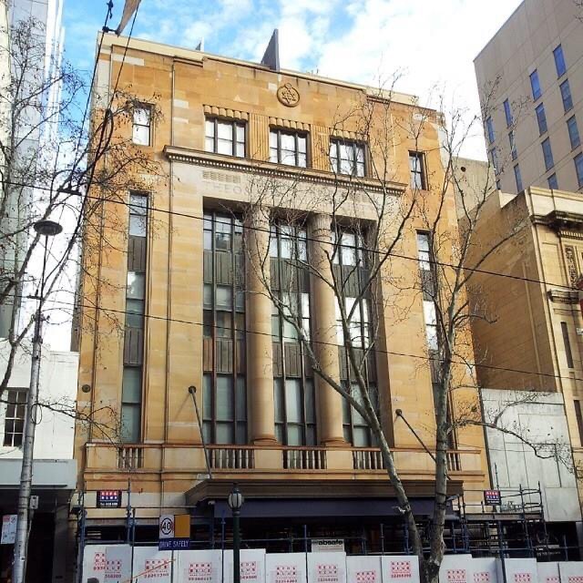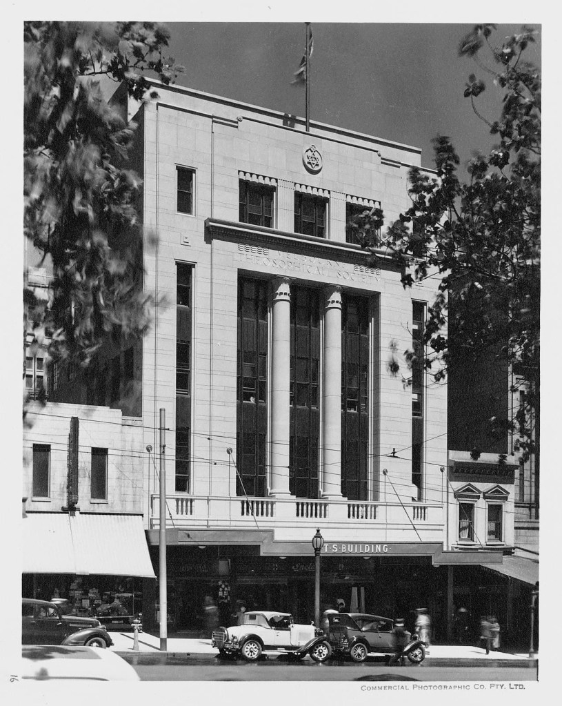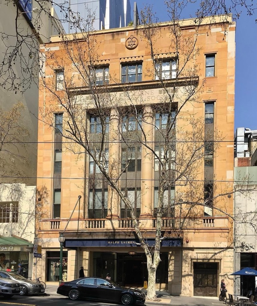 The lovely slightly exotic #TheosophicalBuilding, #MarshandMichaelson, 1936, beautiful stone facade, with Egyptian style columns, a bit patchy though. The Theosphists, a kind of esoteric religion, sold up in c1970, when the @CityofMelbourne bought it along with the Regent planning to replace both with a high rise hotel to help pay for the #CitySquare then underway. What a mess. They eventually sold, and it became apartments in 2000, imaginatively named ‘Regent 187 on Collins’. Some lucky owner has a huge open plan apartment occupying the old lecture hall, seems pretty intact comparing photos from 1936 (probably) and the r e photo I found. Also in c2000 Council gave Ralph Lauren a permit to replace the original shopfront and awning with the current smaller version – that’s new stone at ground level. Pity not to have the original but it’s quite sympathetic. The shopfront itself replaced again in 2013. The entry lobby also looks original. And yes up top is a symbol with both Star of David and a Swastika, adopted when it was more famously ancient Indian than you know what. The Theosophists moved to Russell Street to a less interesting 1920s building (last pic) itself demolished a couple of years ago. Old photos @library_vic