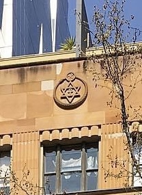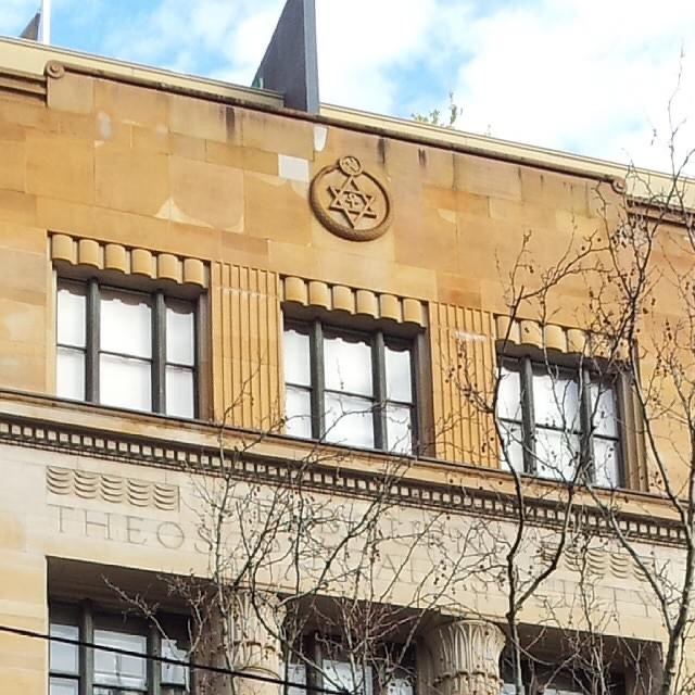 The Theosophical Society, 1937, Marsh and Michaelson. Suitably exotic for an esoteric organisation – #egyptianrevival style columns and a star of david on top. Actually, it’s ‘…the Sanskrit symbol Om above the whirling cross, and then the ouroboros surrounding an hexagram or David’s star with the Ankh or cross ansata inside.’
