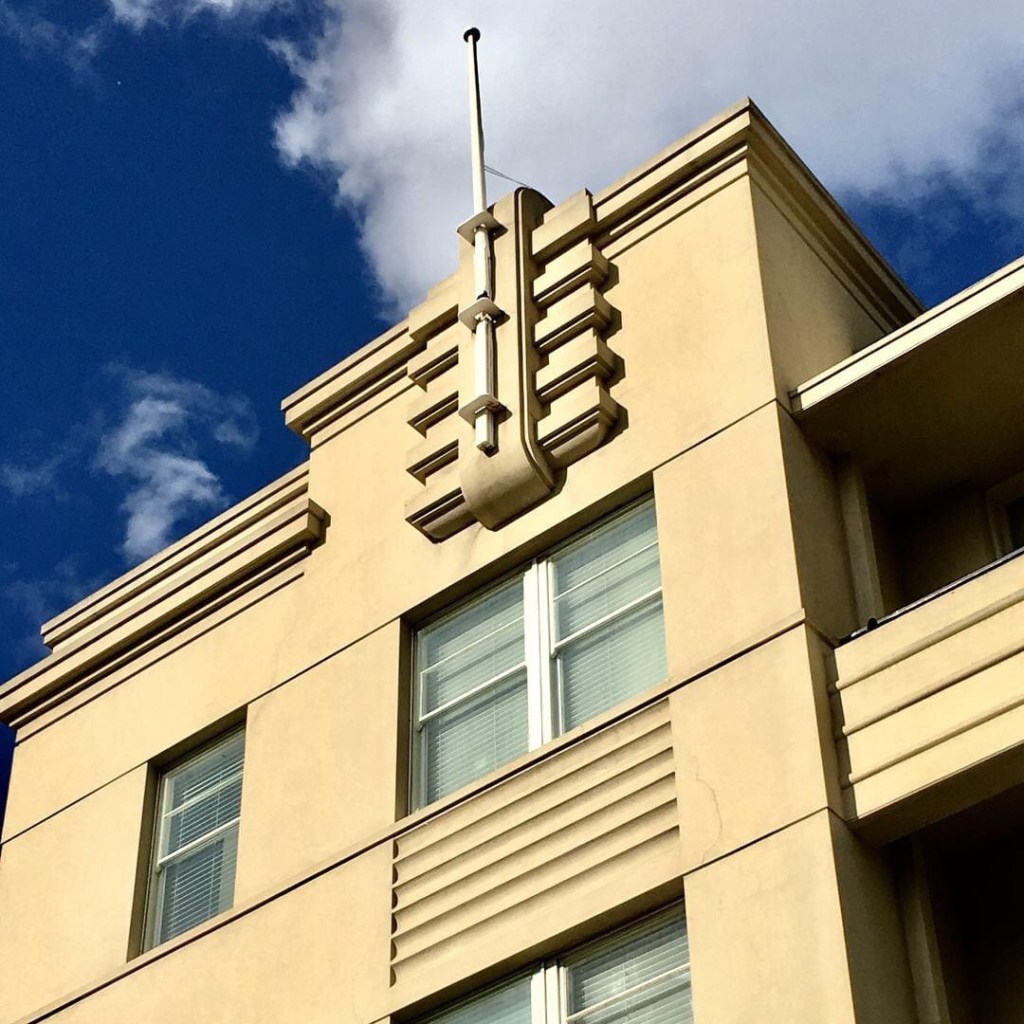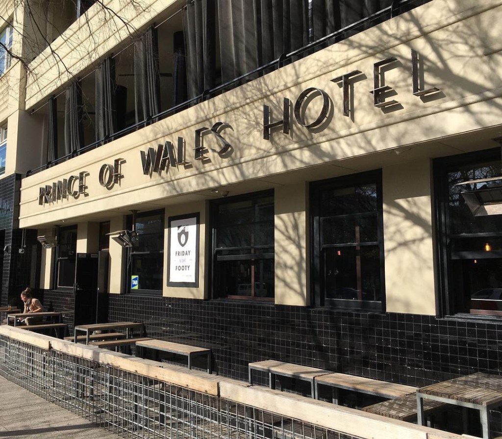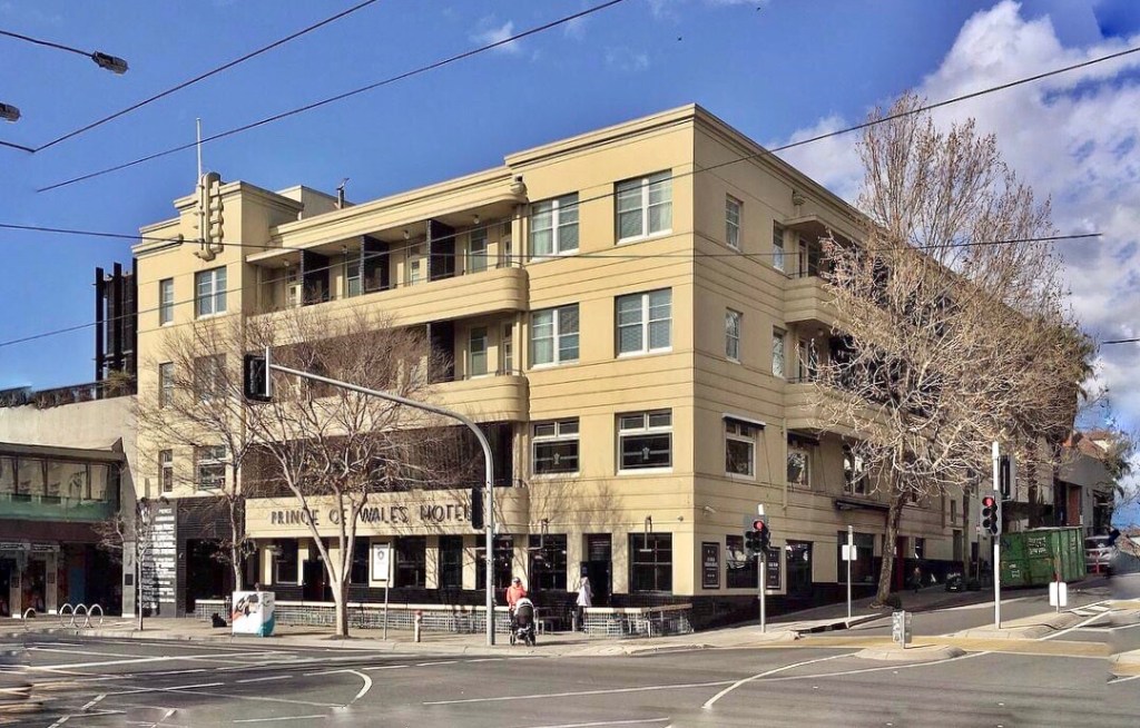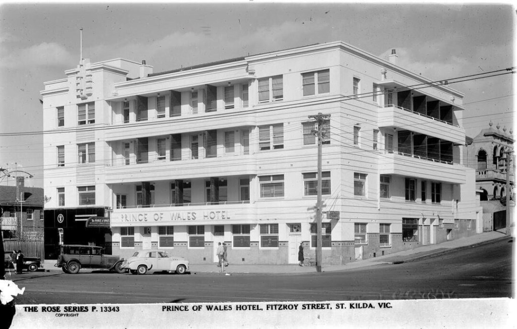 The #PrinceofWalesHotelStKilda, a nice design by #RHMcIntyre (father of Peter) built in 1936. Actually it’s a tad disappointing, it could have been, I don’t know, more streamlined or more decorative; there’s better deco designs around. This is notable though as a mid scale hotel, much larger than your average #pub, but also with great big bars, larger than other residential hotels. Apparently “Nothing was spared in the way of comfort and convenience”. The nicest pub in #StKilda though, with one big and one small bar at ground level, quite intact, the small one complete with a fireplace ! And an unofficial gay bar since at least the 70s. Some of the windows still have their Prince of Wales fluer-de-lis, apparently designed by Loudon Sainthill who went on to a distinguished career in theatre design in the UK.
