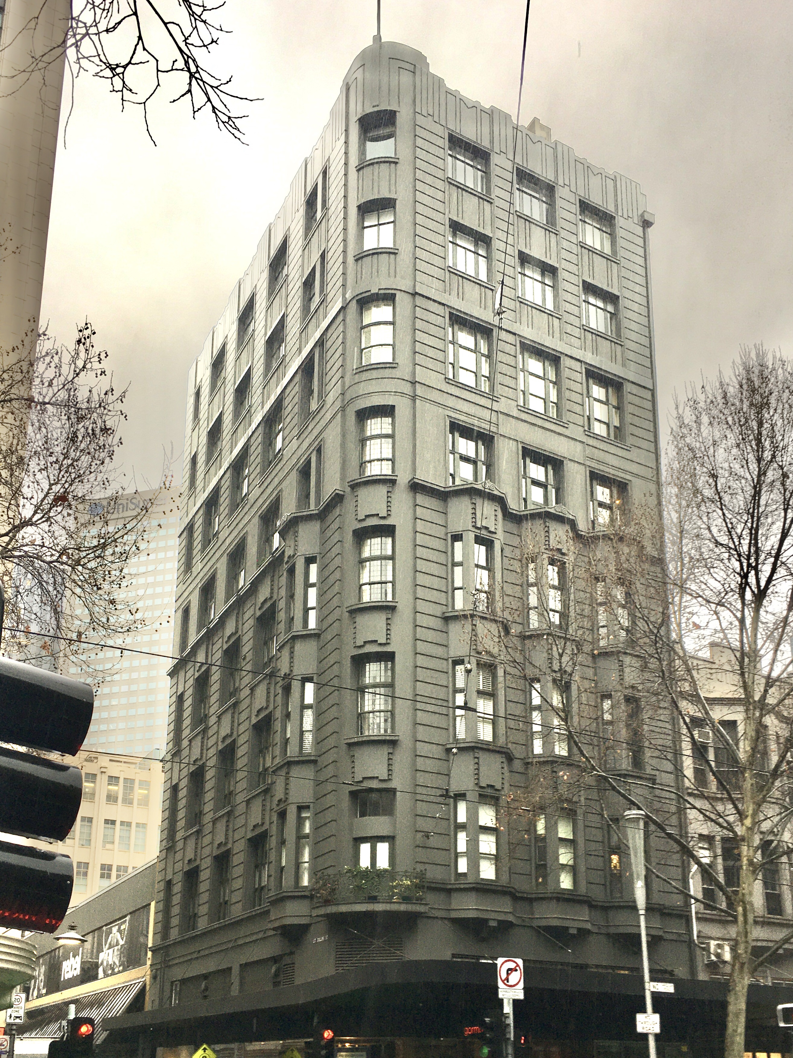Looking spooky in the rain yesterday – this black tower on the corner of Swanston and Little Collins was built for Cann’s Drapery, in two stages, the first 6 floors in 1919, designed by #NahumBarnet, using Monier #reinforcedconcrete (photo 3) which allowed for another 2 floors in 1935, designed by #MarcusBarlow (who did the same trick at Normans Store on Bourke the same year). The top floors were offices. Seems they stayed open during the works (photo 4). Thought it went black recently but no it’s been this colour (a greenish black ?) since the early 80s, around the time Cann’s finally closed. Converted to flats in 1998, I always thought they’d be nice, but seems like small and badly planned and rarely for sale, mainly for rent. You could fix one up much better though (the corner flat 2nd floor has been, doing a lot with a little, photo 9). From old real estate listings, seems there’s two penthouses, but similar finishes, some flats have most windows on the north side (a boundary wall, what if they build up next door??), and the corner flats in the lower section are nice with high ceilings, but still just one bed, with kitchen in the main room. Entry area redecorated 2013 in all marble by Shelley Roberts Architects.