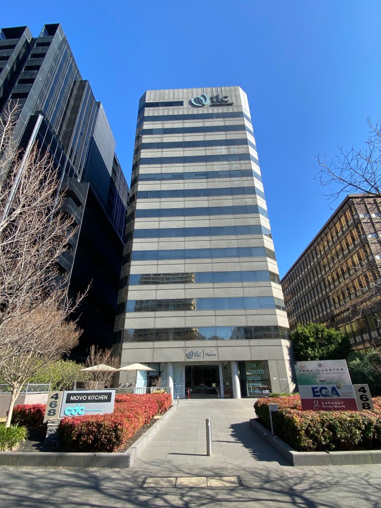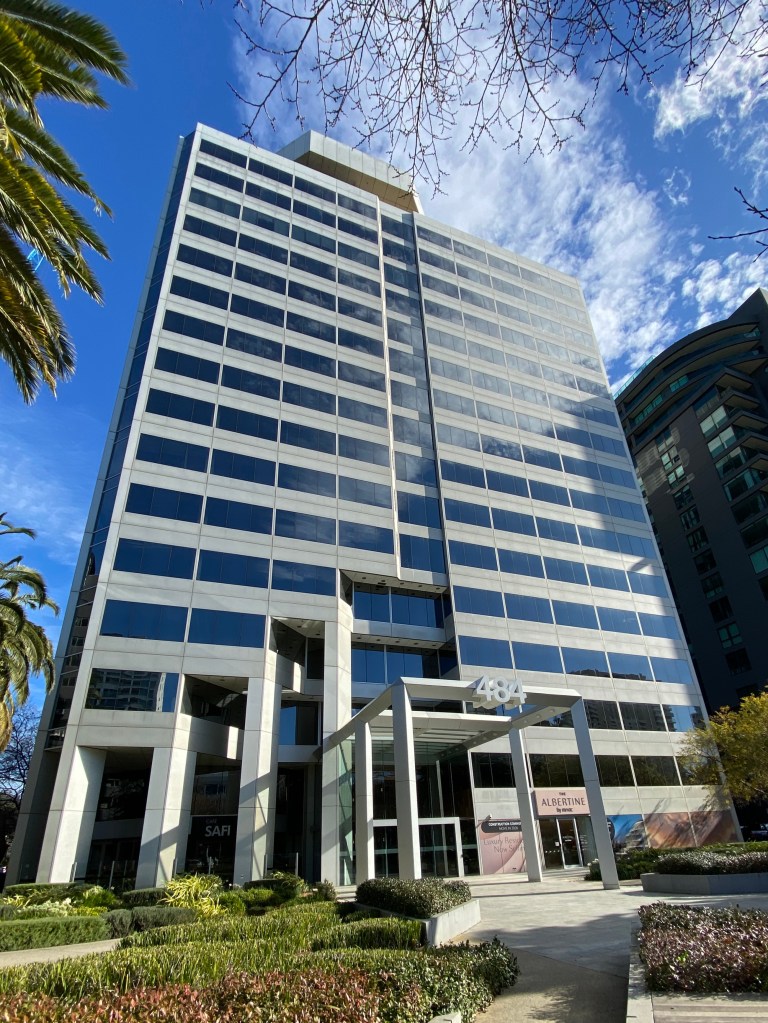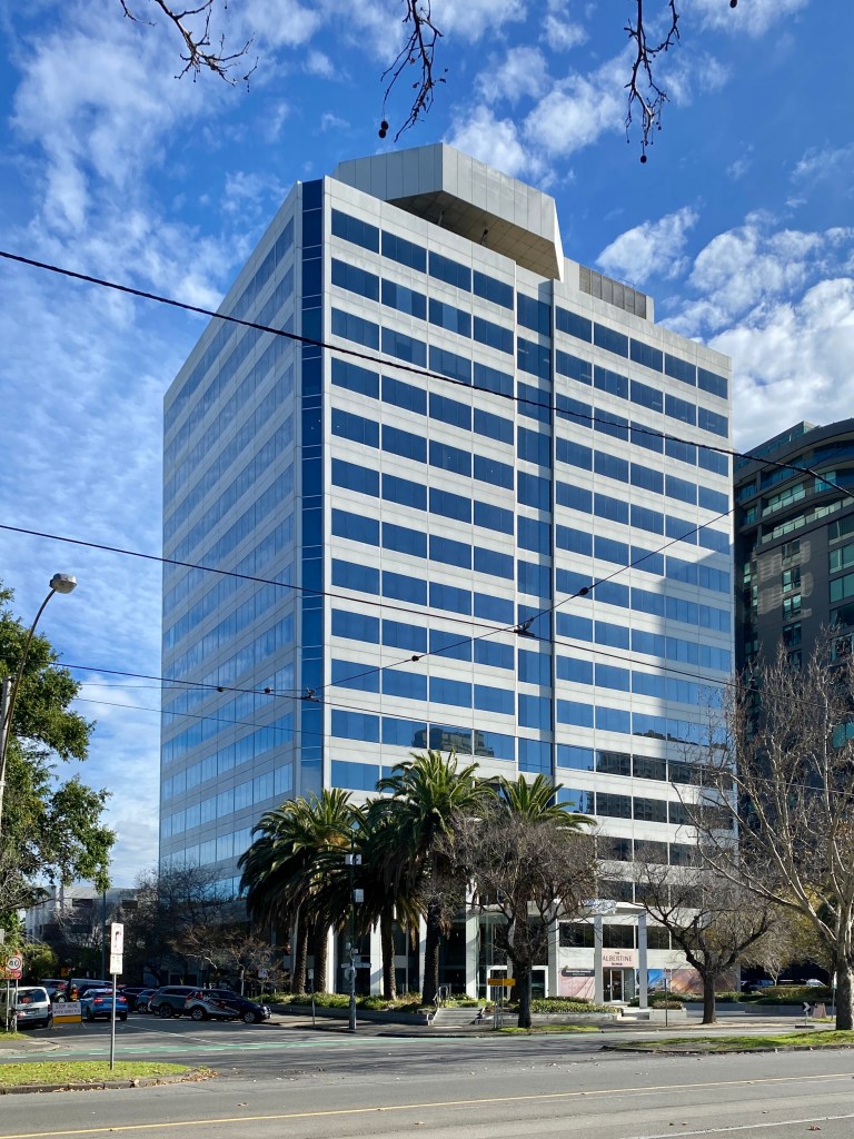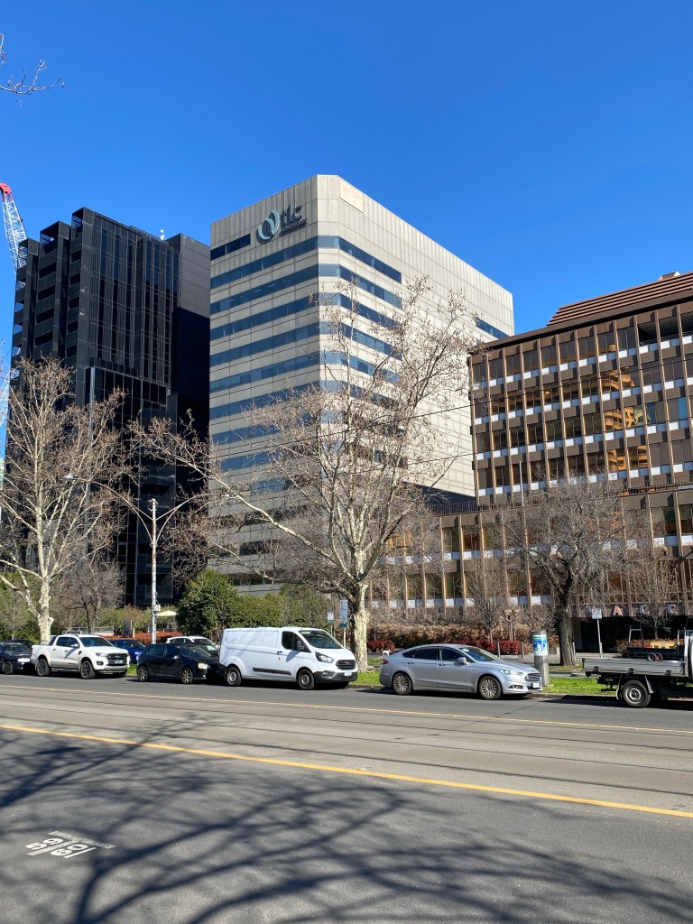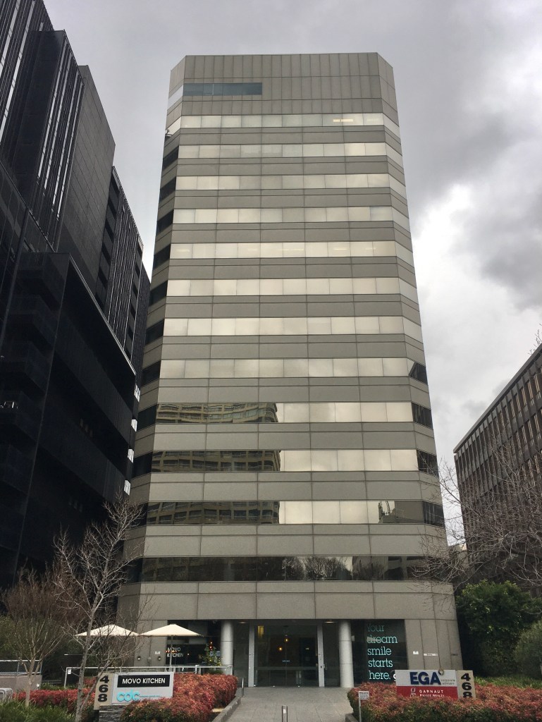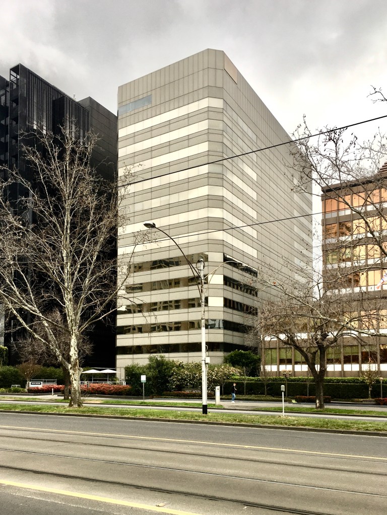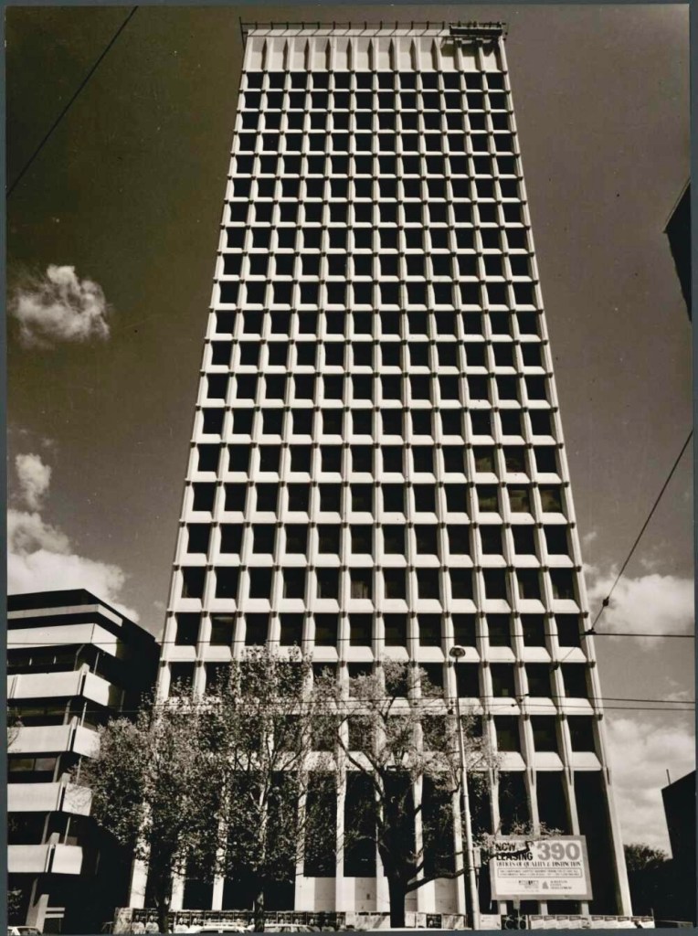 I kind of admired this one at 484 St Kilda Road ages ago for its interesting angled cut outs/ legs in the corner, but actually apart from that it’s just a big box. And there’s the annoying canopy stuck on later that’s tries but fails to match. Relatively nice taut aluminium/glass curtain wall, making it much more Late Modern than Postmodern. By #MeldrumAndBurrows, 1983. This is one of the tallest/biggest from the 80s, when not that many went up the full permitted 60m / 16 storeys. Thanks Simon Reeves for the info.