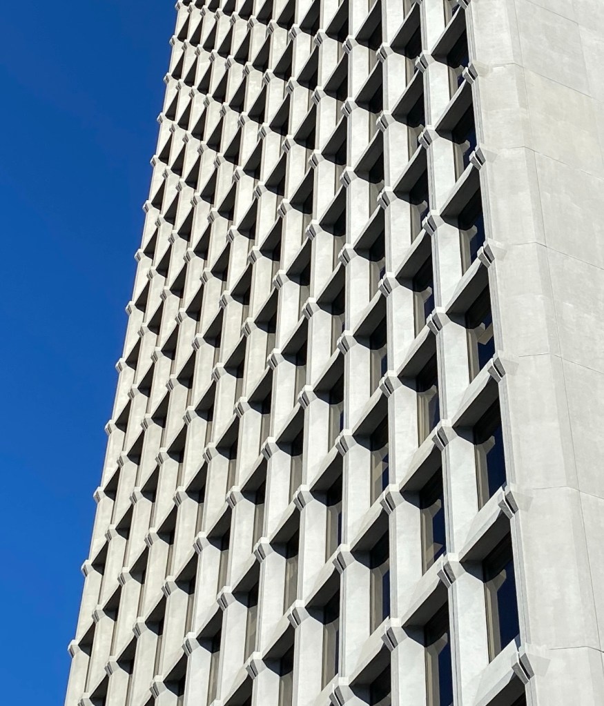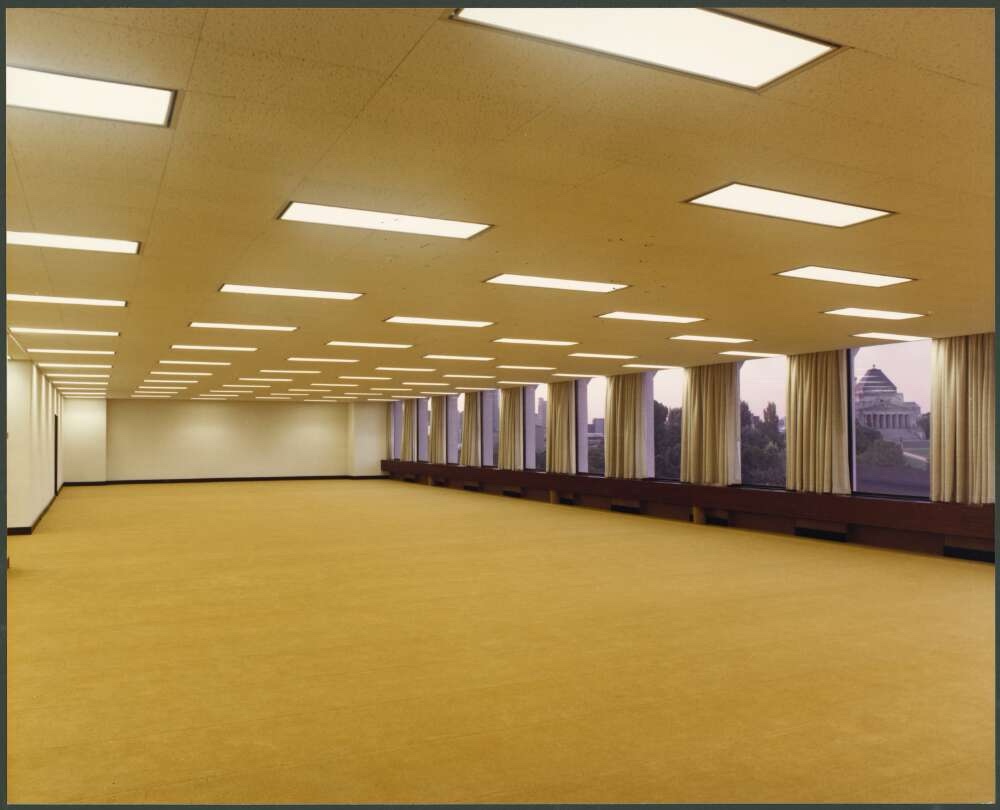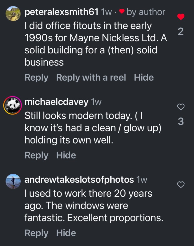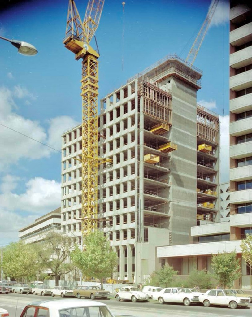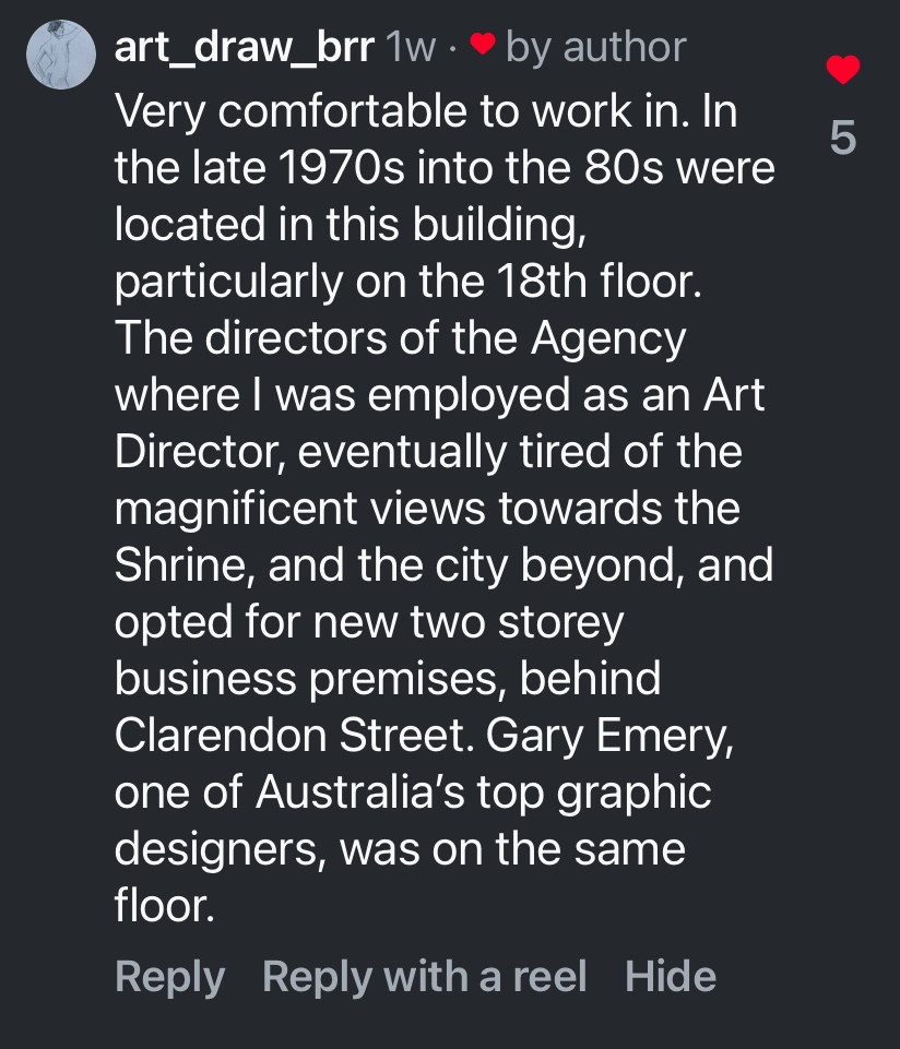 Even though this is the biggest tower on St Kilda Road, and quite monolithic, you sort of don’t notice it that much, perhaps because BP right next door is only a little shorter. It’s satisfyingly chunky and a bit textured, but not terribly exciting. Thought I wouldn’t be likely to find out much, but Google AI led me to the @nationallibraryaus, and a photo of it nearly complete in 1975, noting it’s called Brixton House, and the architect was Graham Jasper (no leads on him though). And @naagovau has more, one during construction showing I think that the exterior is load bearing precast, and an office floor with mad yellow carpet and ceiling, and the refurbished foyer in 1986, with pink chairs and a BMW.