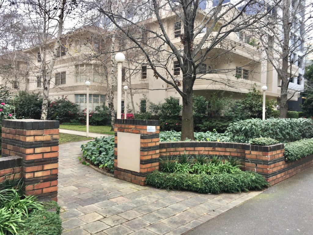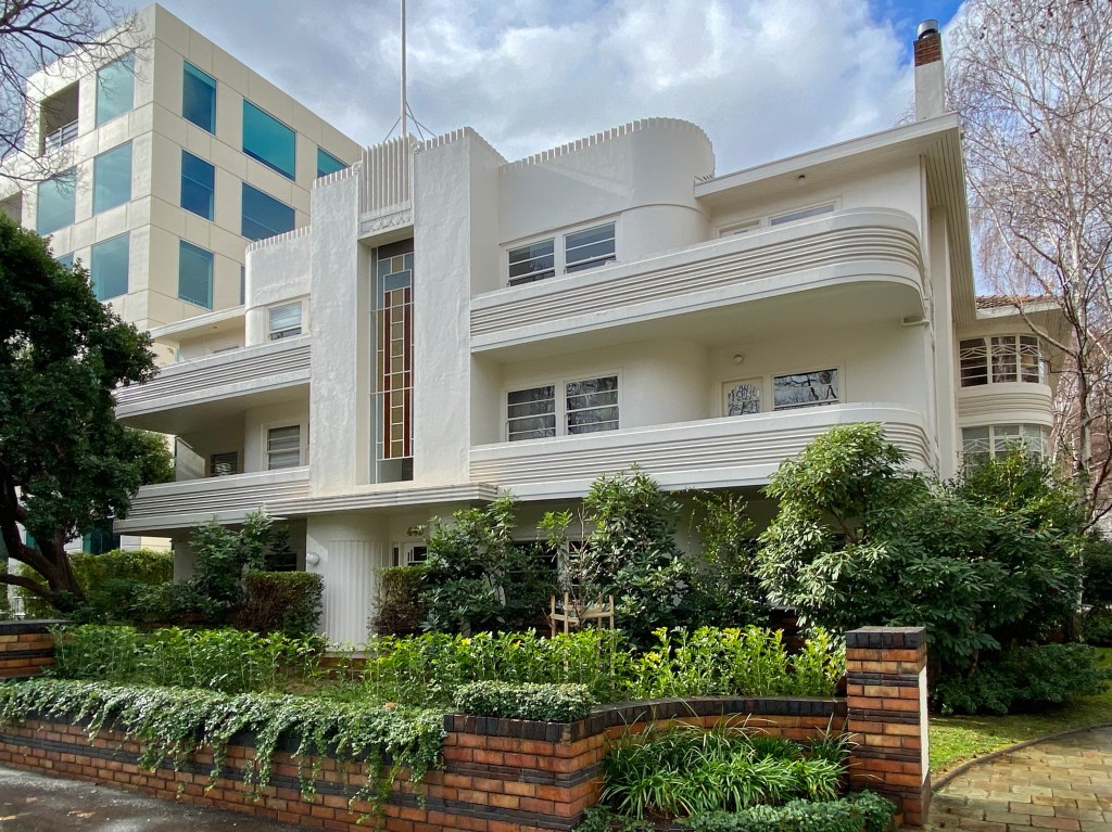 Designed by Lewis Levy in a smart streamlined mode, but most interestingly, the 60 flats face both the internal garden and four more side gardens as well, snaking in and out down the block. It was one of the biggest flat developments in Melbourne at the time.