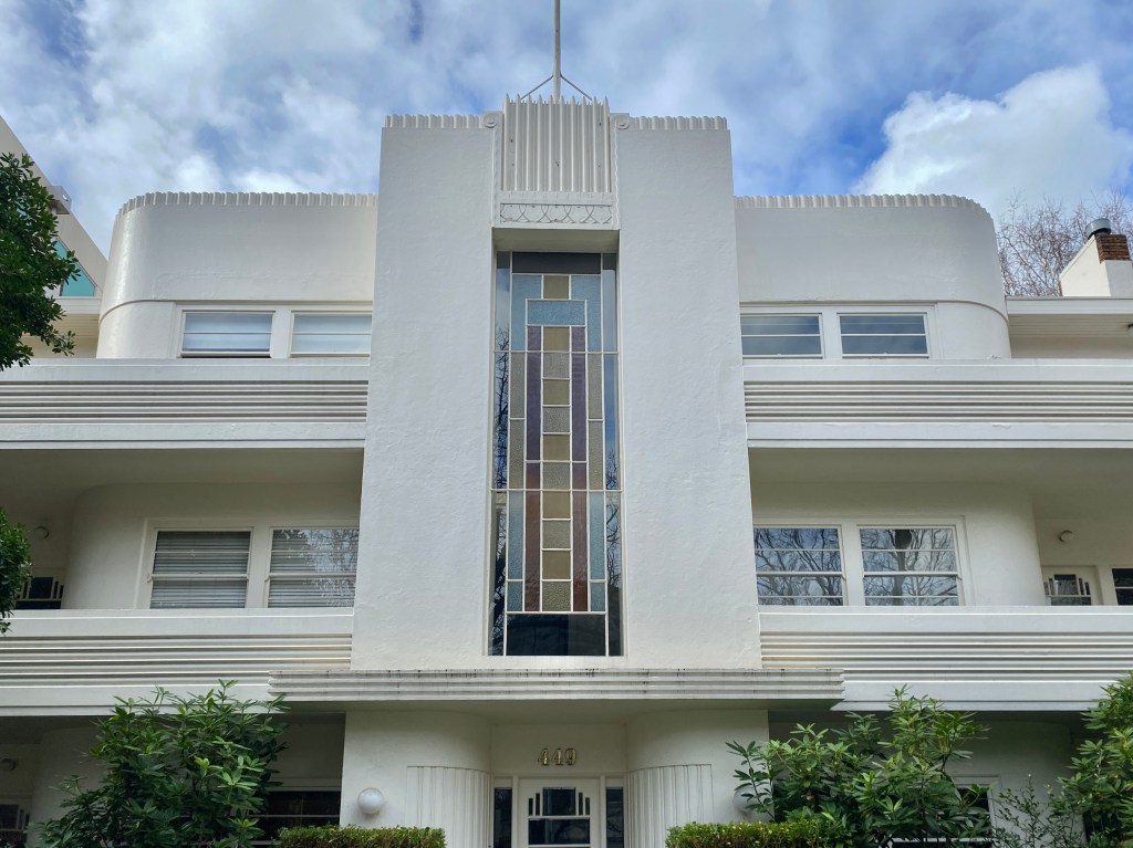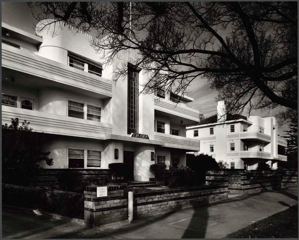 Kia Ora, #StKildaRoad, one of those places you know from the tram, a big set of #ArtDecoFlats, built 1936/37 in two stages (replacing a 19thC mansion and the house next door, only 12 years old).