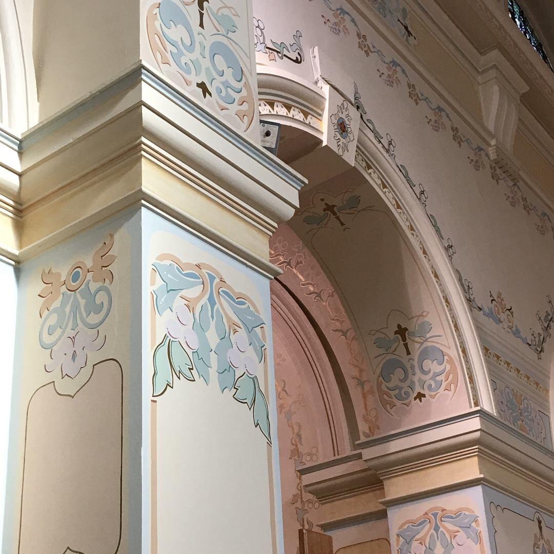 Finally got to see inside #SacredHeartStKilda, #JosephReedArchitect; surprisingly only the front part of the nave built in 1884, the side aisles and the altar end added in 1922 (after a fire- must’ve been short and tall looking !), but reportedly completing the Reed design (certainly the sides match the front perfectly). The Reed design was an unusual departure from the Gothic to Classical, specifically a bricky Renaissance veering towards the Baroque, or at least Mannerist details. The #campinile however is definitely 1922, and entirely by #KempsonandConnolly, architects of the extensions. Delightful pale #stencildecoration, though not sure if it’s 1922, or 1940s based on 1901, two different dates given. Looks v 1901 to me. It was repainted/restored in 1984 for their centenary by Mulholland.