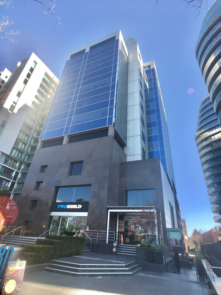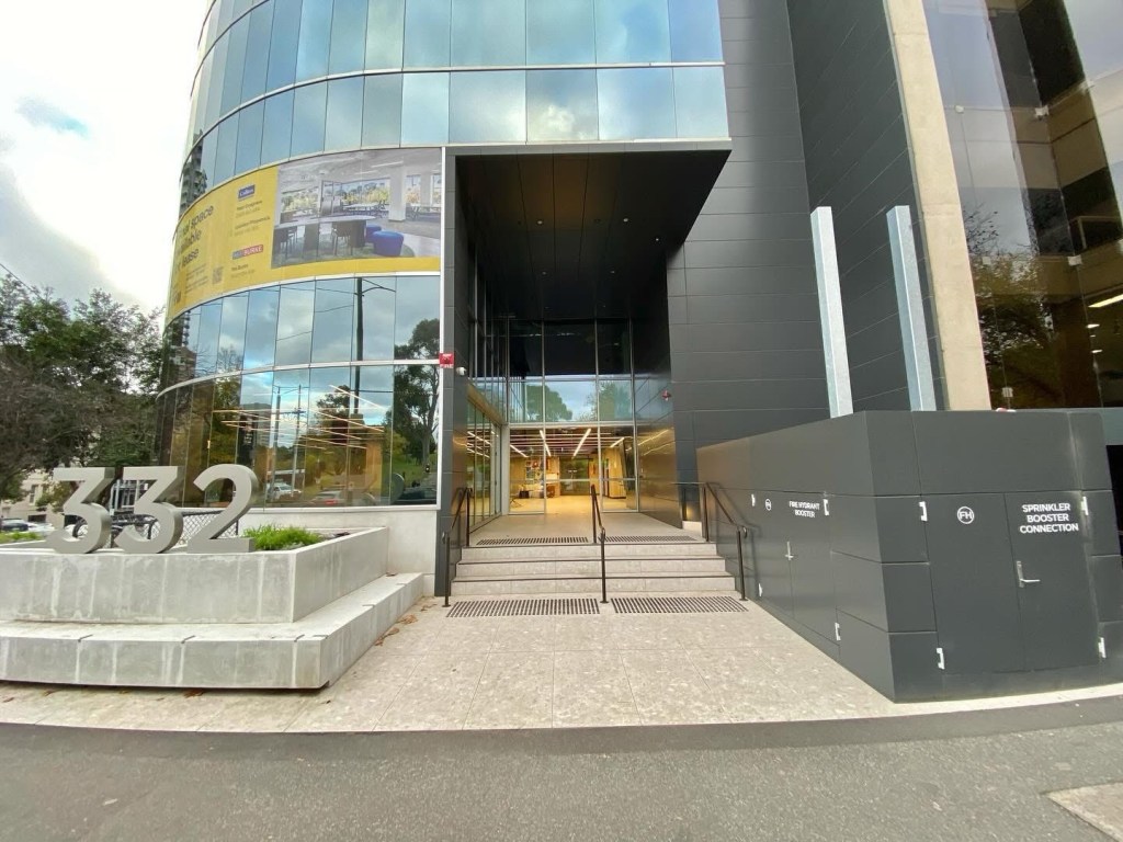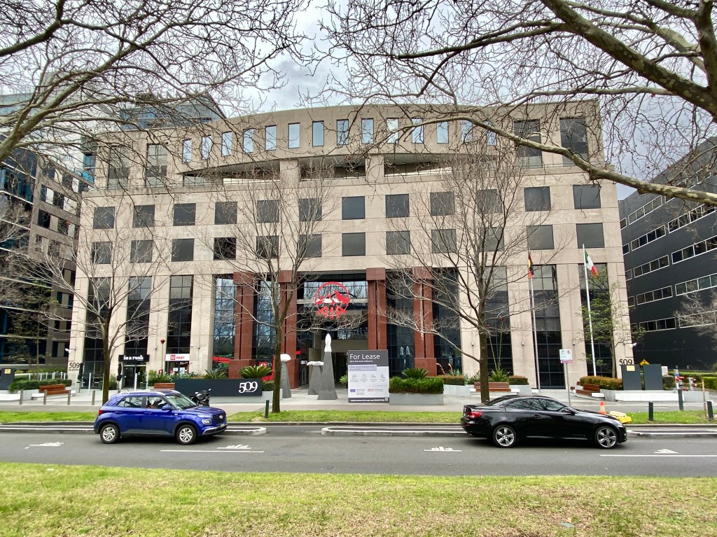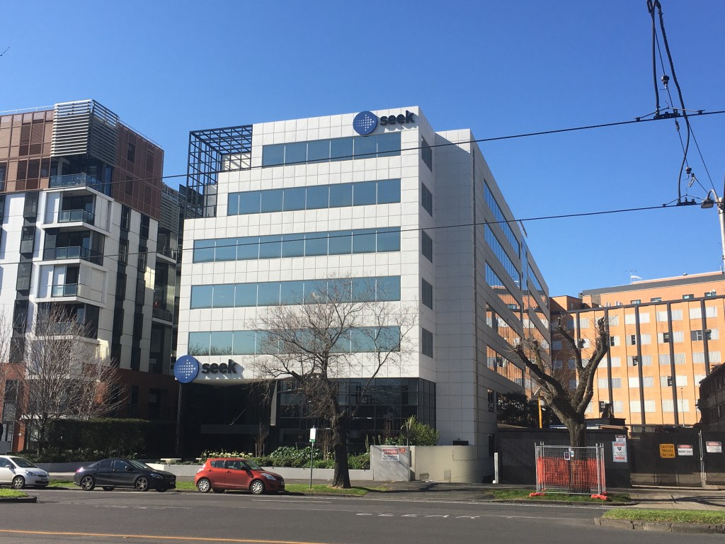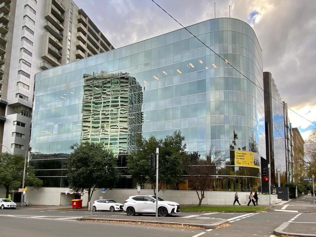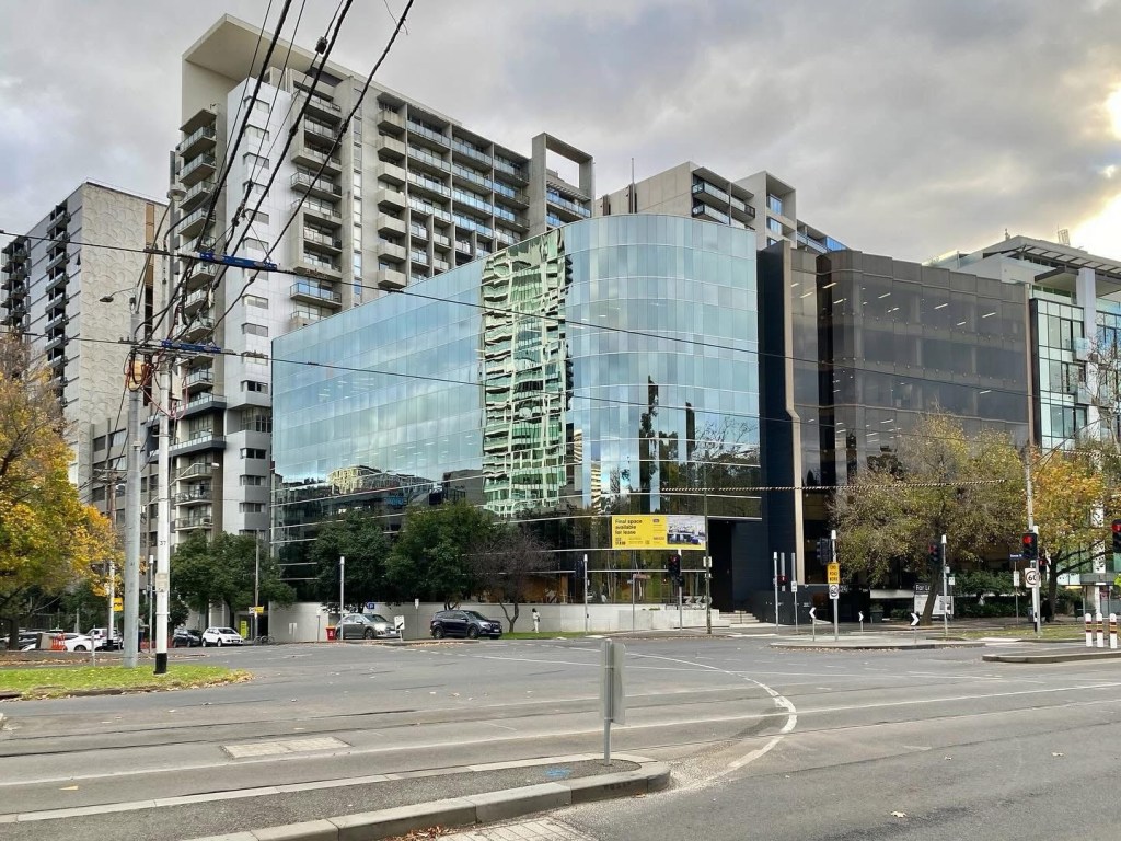 A bit of St Kilda Road pomo maybe not long for this world. It’s got a lot going on – a fun clock tower which is actually the lift tower, with a glass front, lots of angles picking up on the angled site, and a zig zag sticking out entry thing next to the preserved Gas Valve House. Dull serried square windows in precast panels not so fun. Don’t know architect, but built by Lend Lease in 1988 (Age article may 1988). The Cancer Council had been there for 10 years and sold up in 2022, and the only heights limit is the Shrine Vista, allows something pretty tall at this end. Photos from oct, 1st one real estate ad.