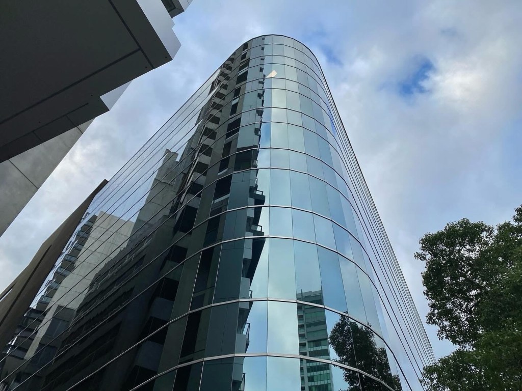 I’m such a fan of 80s mirror glass, I guess it’s just so extreme, this one on St Kilda Road, cnr Dorcas Street in particular- it’s quite sheer, curved corners, a cut out entry, and it’s kind of wedge shaped to boot. But not quite as extreme as the square one further town the road.