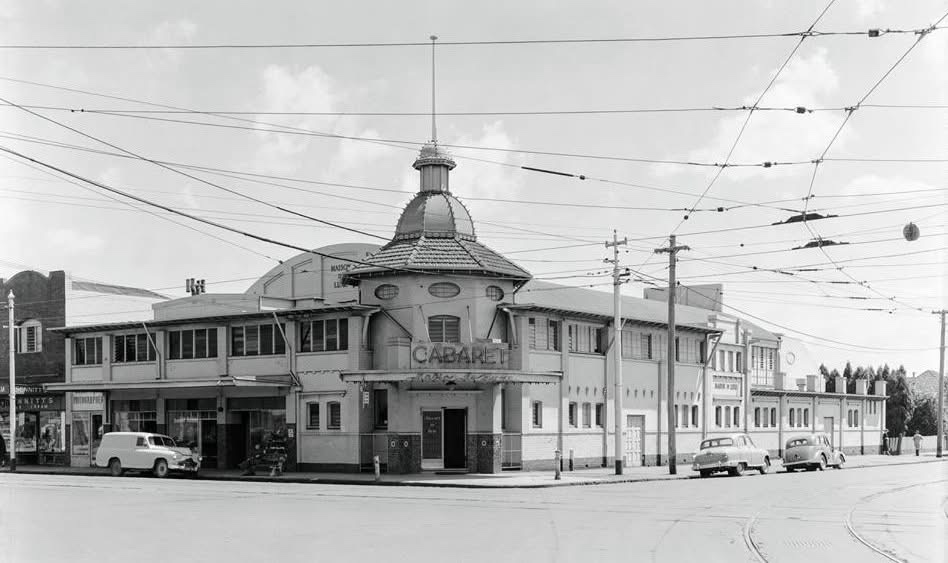 Across the corner there was another striking building, the Maison Deluxe Dance Palais; these and the shops and bank all grew up after the tram was extended along Glenhuntly Road to the beach in 1915, crossing the 1906 St Kilda to Brighton tram at this point. That line closed in 1959, the Glenhuntly one in 1960, the date of the B&W photos. The Palais thing was gone by the 70s.