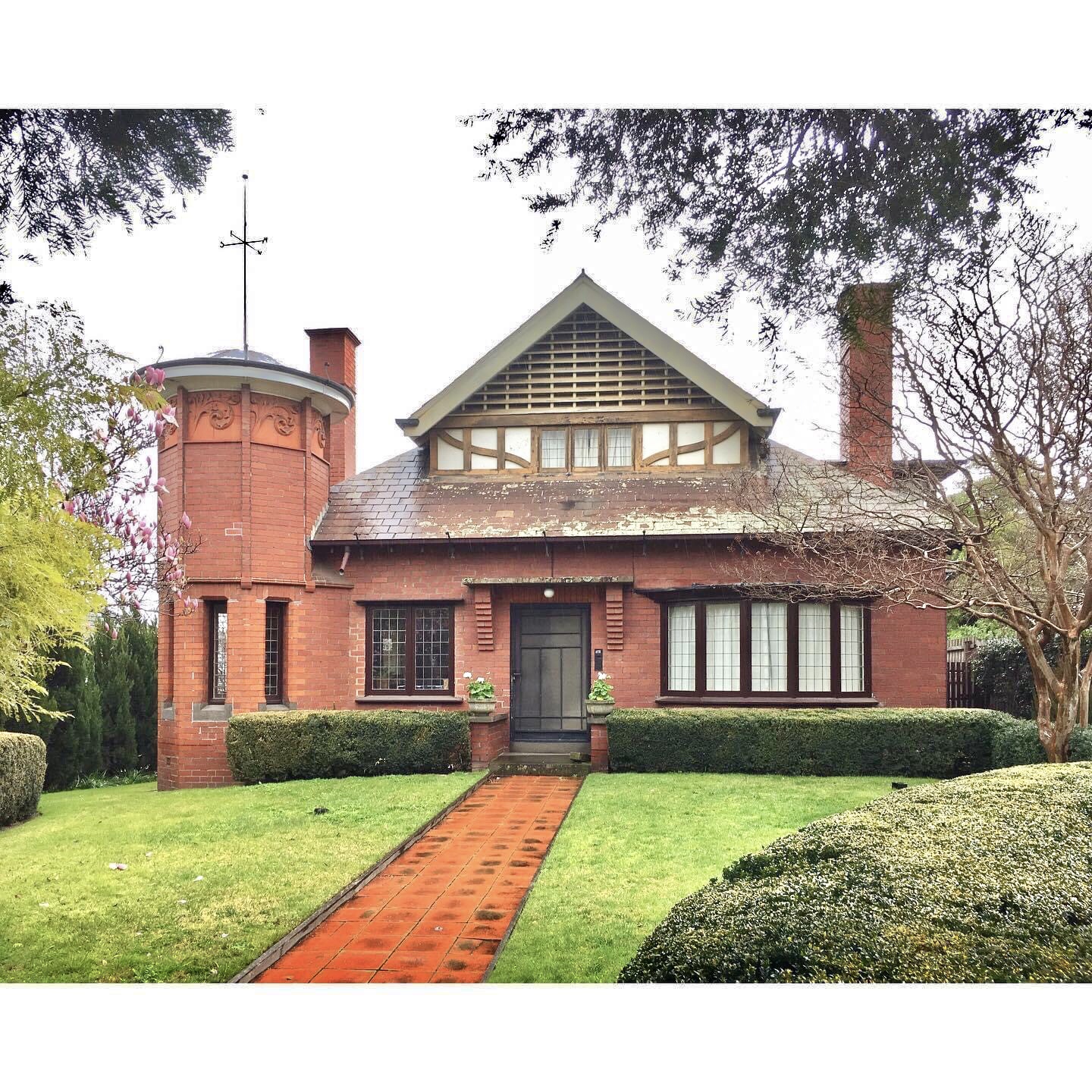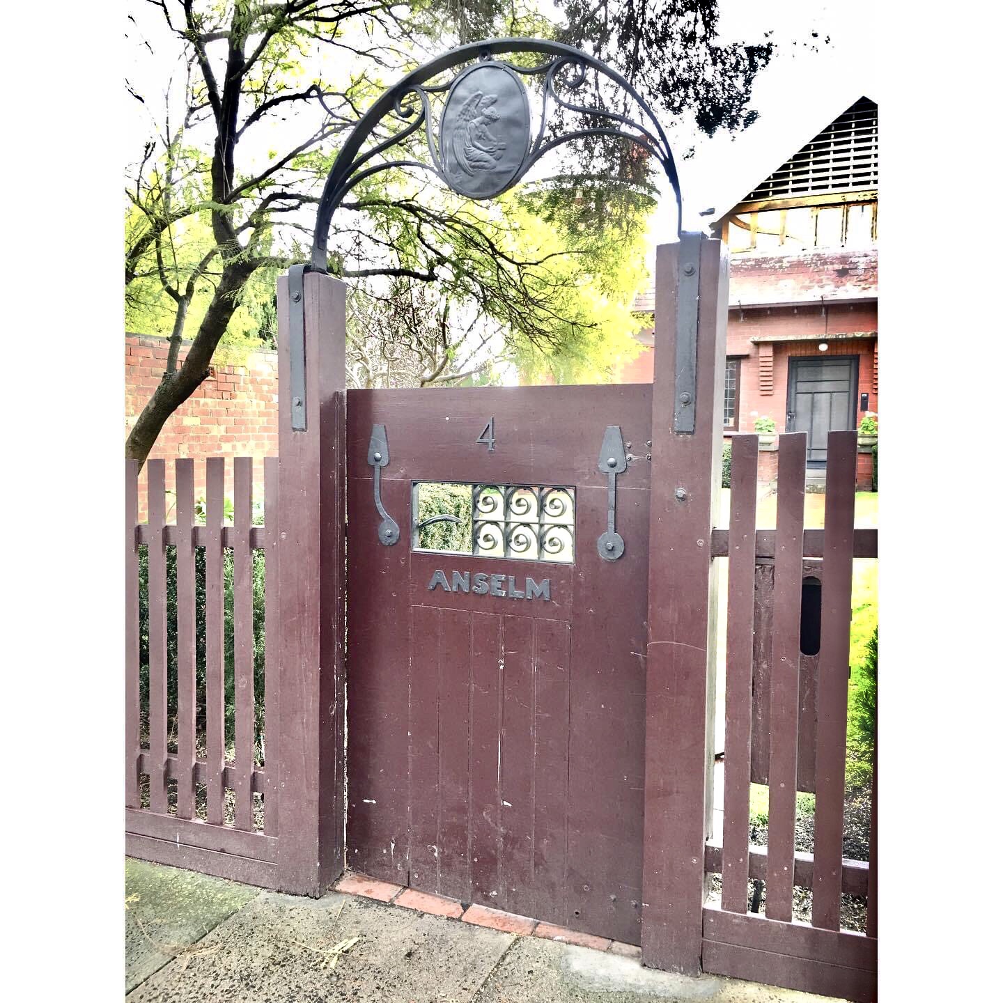 Very cute ! #Anselm, architect #RobertHaddon’s own house from 1906 in a little street in Caulfield just south of the Glenferrie and Dandenong Rd corner. Great details inside apparently. Love the spindly weathervane, the #terracotta on the turret and the gate is good too (with an angel holding a church ??). Haddon was the leading light of the #ArtsAndCraftsMovement in #Melbourne, helped start the #ArtsandcraftsSociety, but also ran the architecture course at the #WorkingMensCollege (#RMIT) and also ran a practice called the Central Drawing Office doing designs for other architects ! This is one of the few things definitely only by him. He worked for architects who did lots of pubs and houses, so often anything with some Art Nouveau or unusual details like circular windows or artistic asymmetry is said to be him.