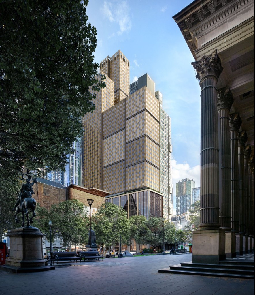 Aurora Melbourne, #LaTrobeStreet, vision vs reality, both images from @elenbergfraser, 2nd side by side from 2018. Surprisingly the render is exactly right, except for the colour. Funny how it’s so tall, 90 floors, but not really a landmark. It would look better in morning sun, but then this is what it looks like from the state library side all afternoon (and yes it’ll shadow the forecourt after 2pm in the winter half of the year). Another #ElenbergFraser curvy reflective tower.