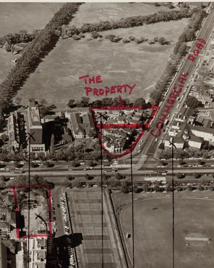 The fabulous Pasadena Mansions, built c1918, ‘on the corner of St Kilda Road and Commercial Road’- but as far as I can work it out, actually located along the block next to Fawkner Park. Think it later got an extension on the corner, possibly called Coronado. In the 50s it got converted horribly into offices, then finally dem after 1976, the date of the aerial photo. I think it was replaced by the slightly interesting steppy flats there now, while the corner was replaced by a slightly brutalist office block. Something called Arundel Flats was there too somewhere, which look like Edwardian terraces, noted as ‘part of the development’.