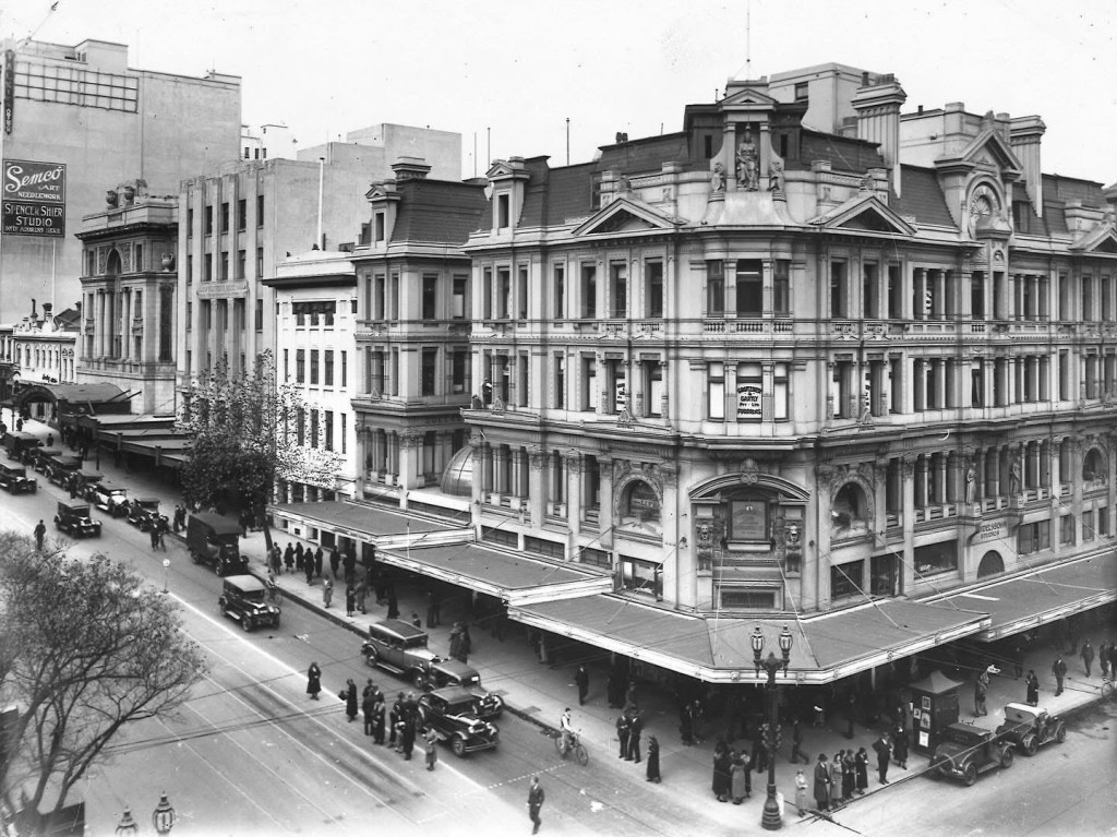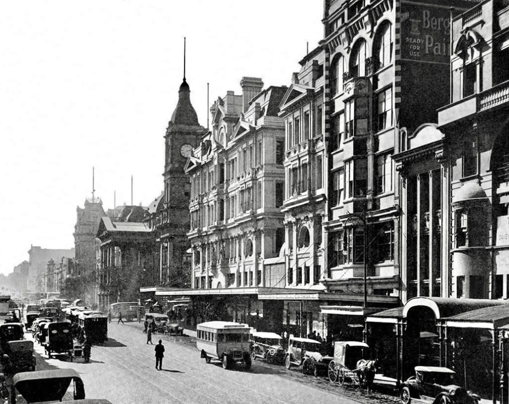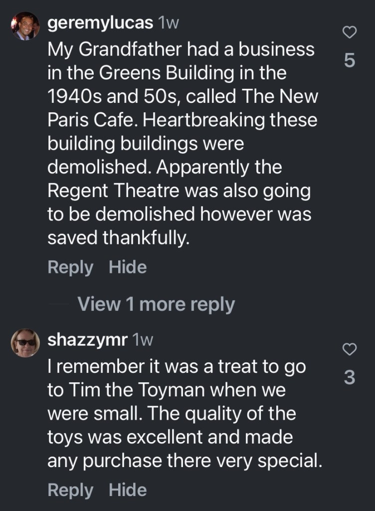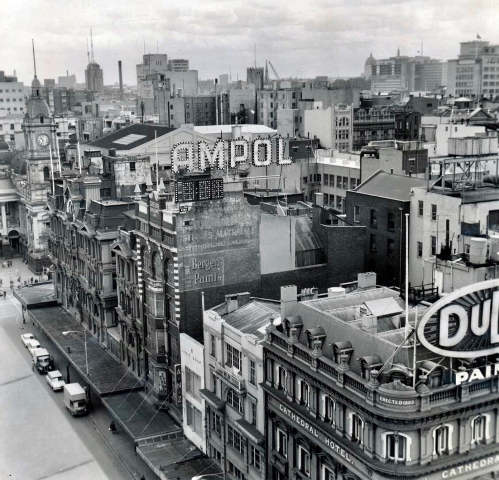 Council then over the next 5 or so years bought and demolished the rest, about a dozen buildings altogether. From the Victorian Cathedral Hotel, to the Edwardian Greens Building (with AMPOL sign on top), and the Art Deco Wentworth Building next to the Regent, which had the Regent Place laneway next to it, where Tim The Toyman was (so I’m told).
