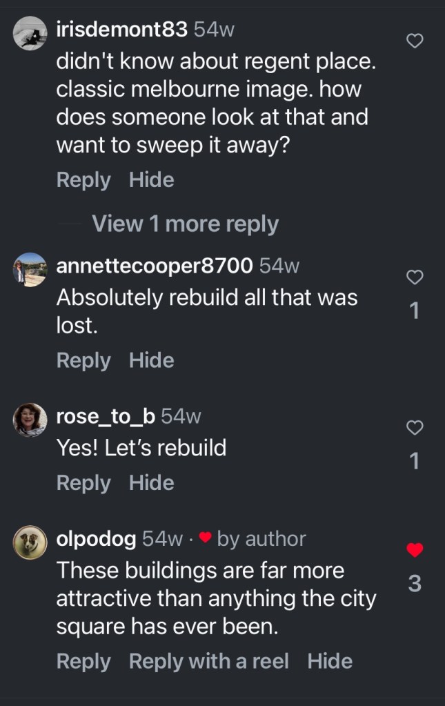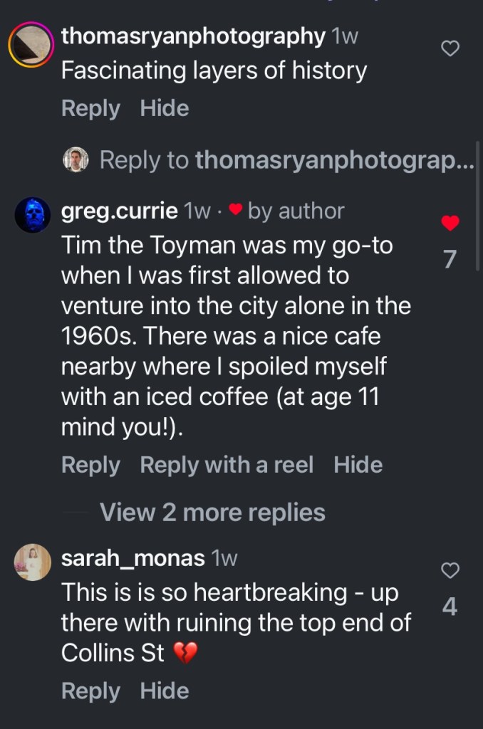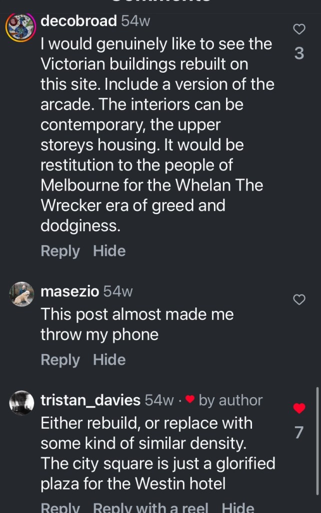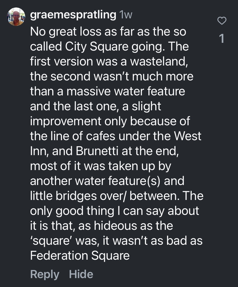So a rather dense and much used part of the city became the rather open and less used city square by 1980, deemed a failure, rebuilt 1997-2000, and that one demolished in 2017 for the Melb Metro, does anyone miss it ? I mean the trees and grass along Swanston Street were nice, but the rest of it ? Do we need it, now we’ve got Fed Square ? Maybe we should rebuild all that was lost. 🤓