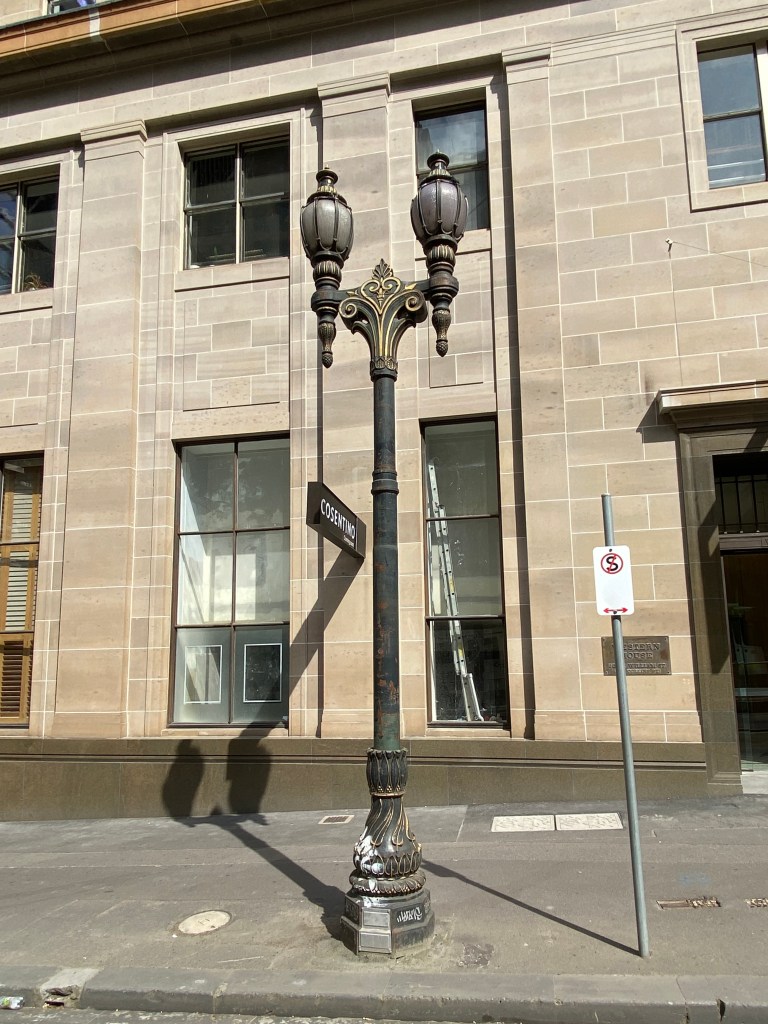 #CastIronStreetLamp, #WilliamStreetMelbourne, erected 1929/30, one of only 2 left of dozens that once lined the streets of the #MelbCBD. The other is across the road down the hill. Don’t know why these two remained while all the others were replaced in the 1960s with modern street lamps. Many ended up in the gardens of big houses in Toorak and Brighton or outside public buildings, and there are two outside 11 Highlander Lane nearby, clearly not their original location.
