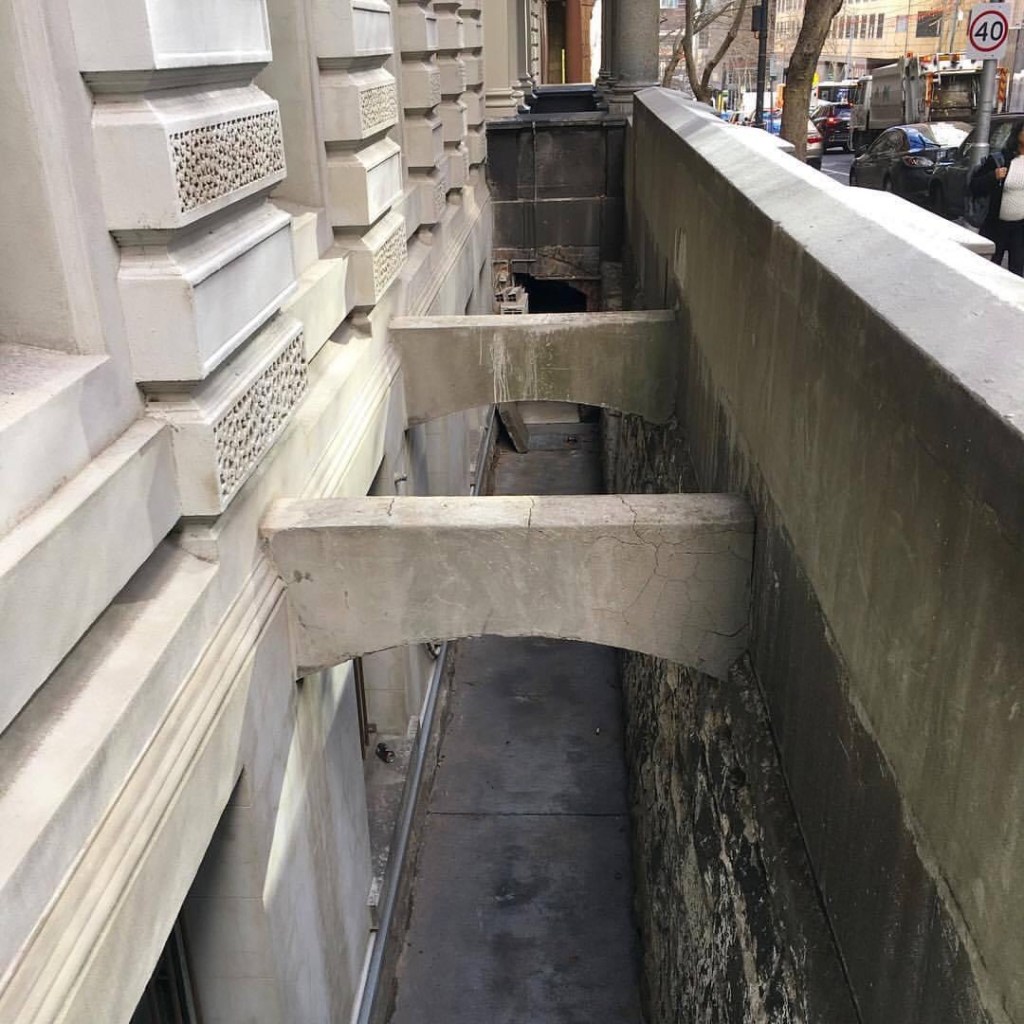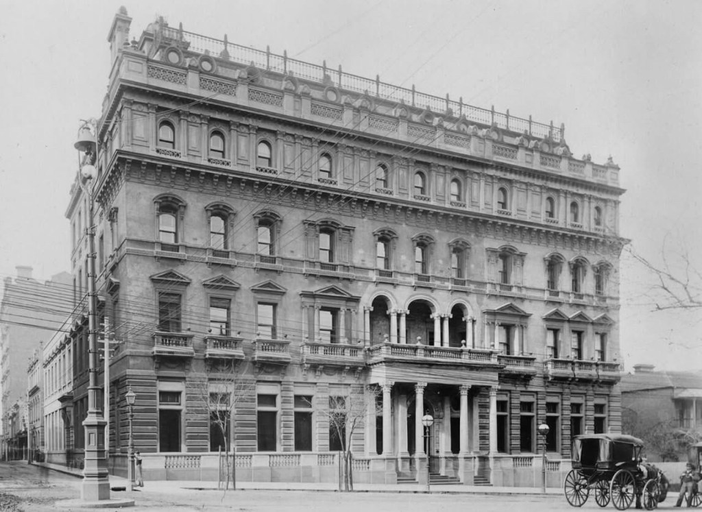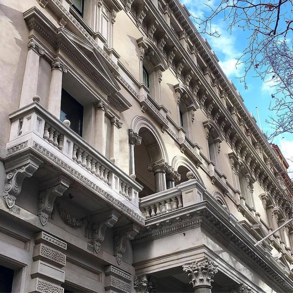 The #AustralianClub, the other great #mensclub after the Melbourne Club, built for the businessmen and squatters whose offices and storehouses were at this end of town. The main part was built in 1879 designed by #LloydTayler, extended to the lane behind in 1884. Then in 1890 they decided to enlarge it with four bays to the right, designed by J Charlesworth, replicating the facade details but a bit squeezed up. He added the almost central entry, portico, huge stair hall, and the enormous salon/dining room. Completed 1893 just as the Victorian economy crashed to a nadir.