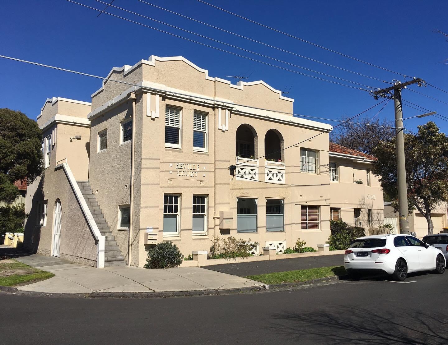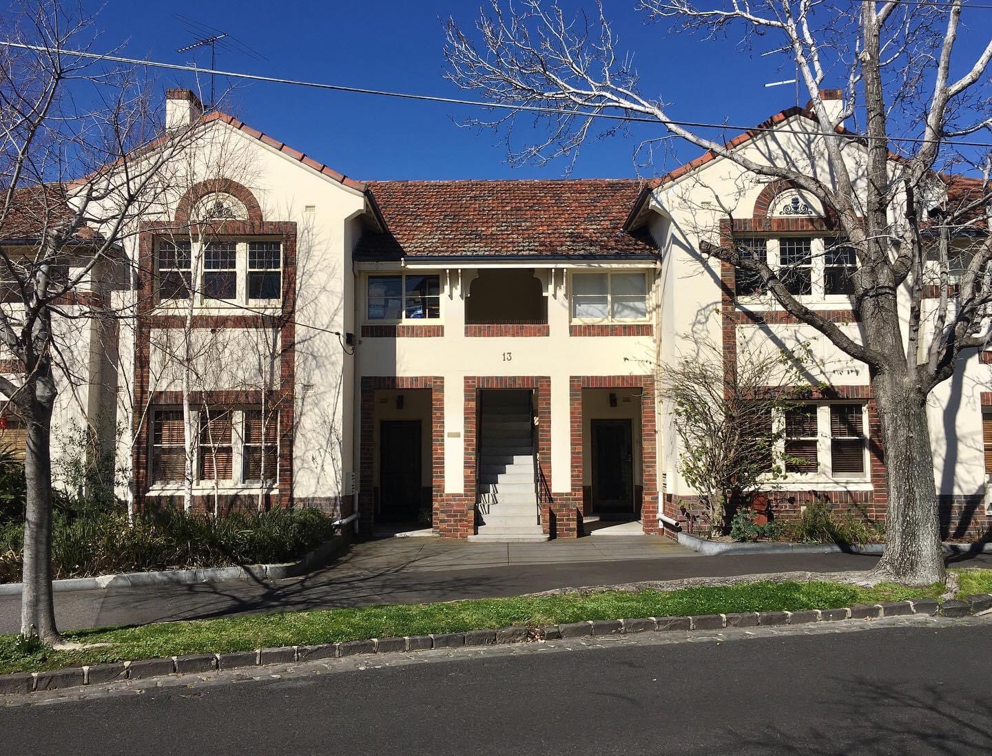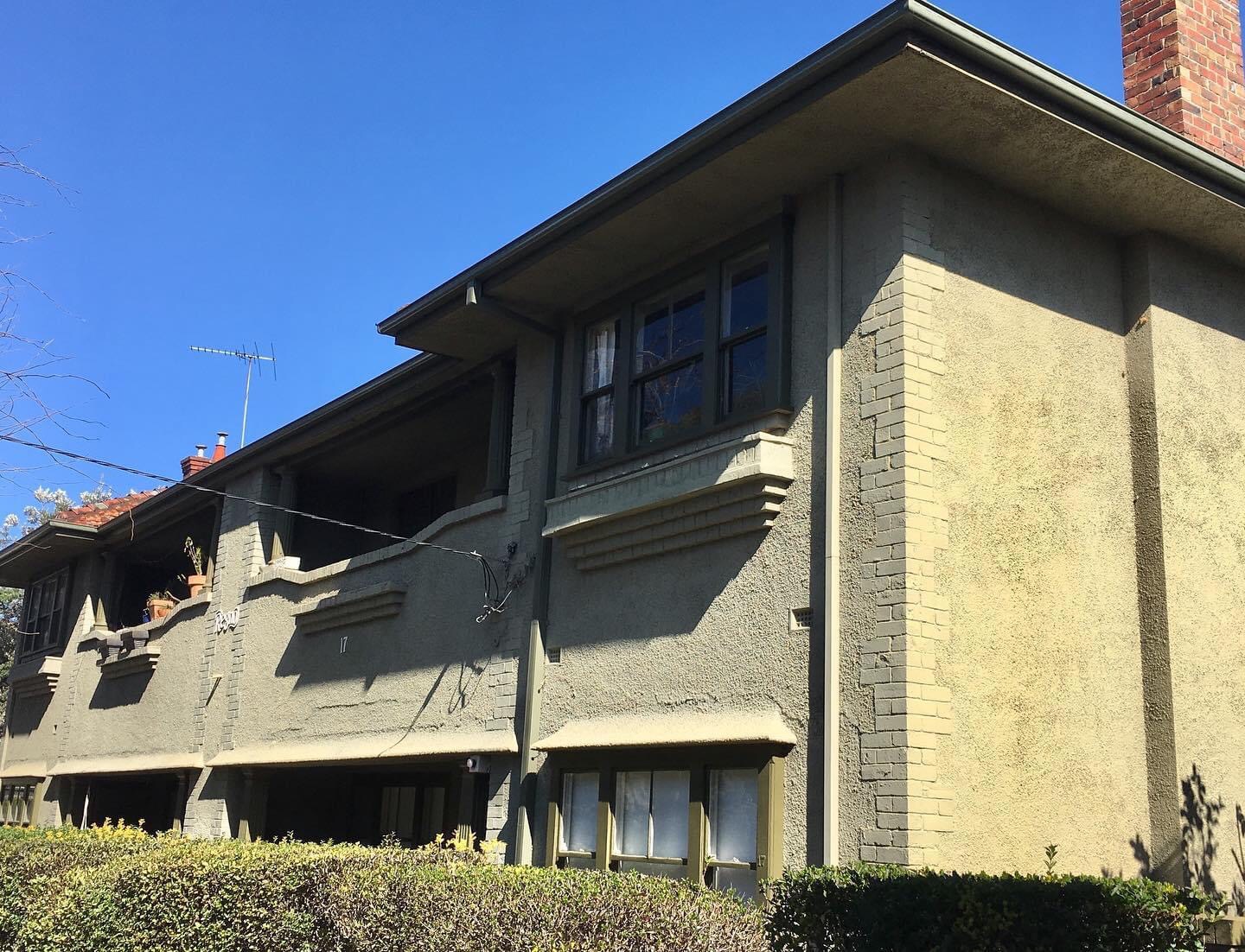 The late 1920s flats and houses on Windermere Ave- land that was the grounds of the #VictorianMansion Rothermere in #Elwood – are great ! Now Windermere Ave. Quite photogenic too because not that much garden in front, but mostly enough to soften the edges. Great names too; the corner one Neville Court has fab #stainedglass windows.