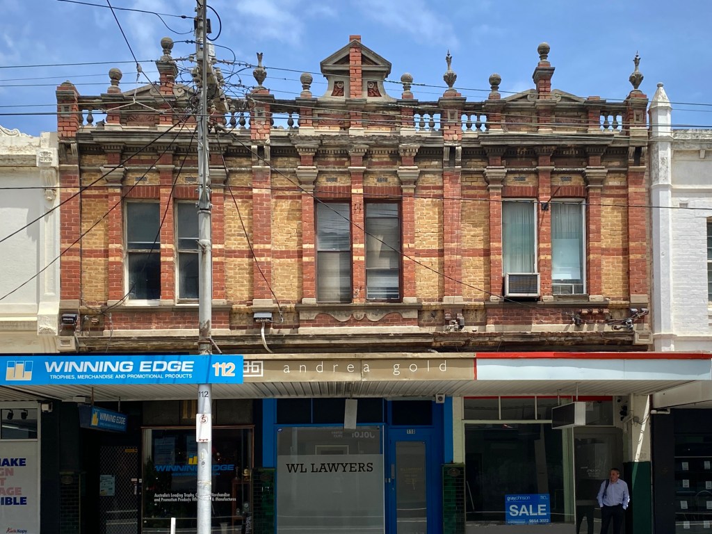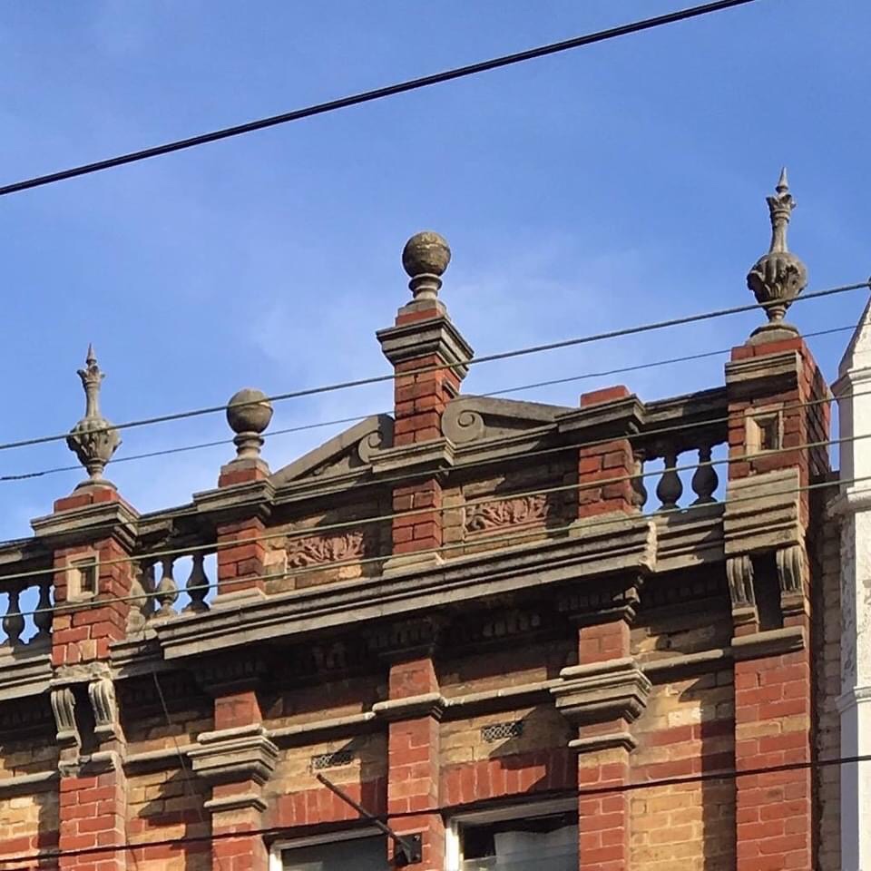 Very inventive #queenanne / Flemish influenced #shoptop #facade in #BridgeRoadRichmond. The #parapet has most of its #knobs and #urns intact, which is unusual, as is the whole composition, with square brick #piers rising right up through the parapet, with a pattern of cream bricks, and there’s some #aestheticmovement sunflowers up there too.