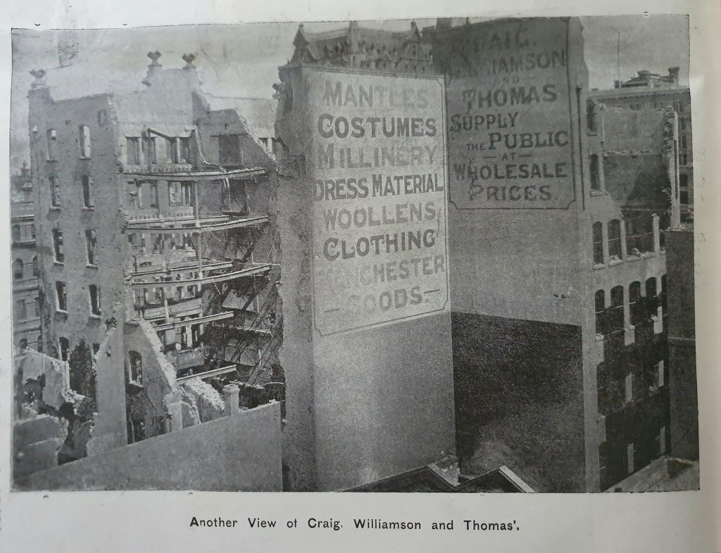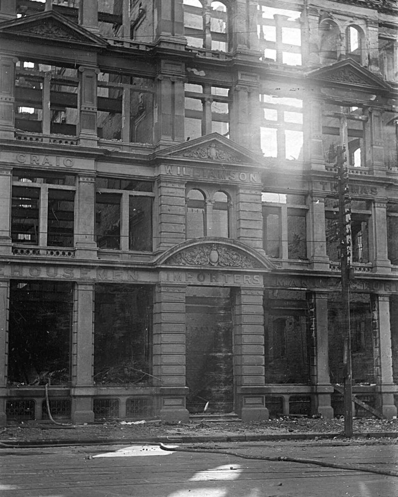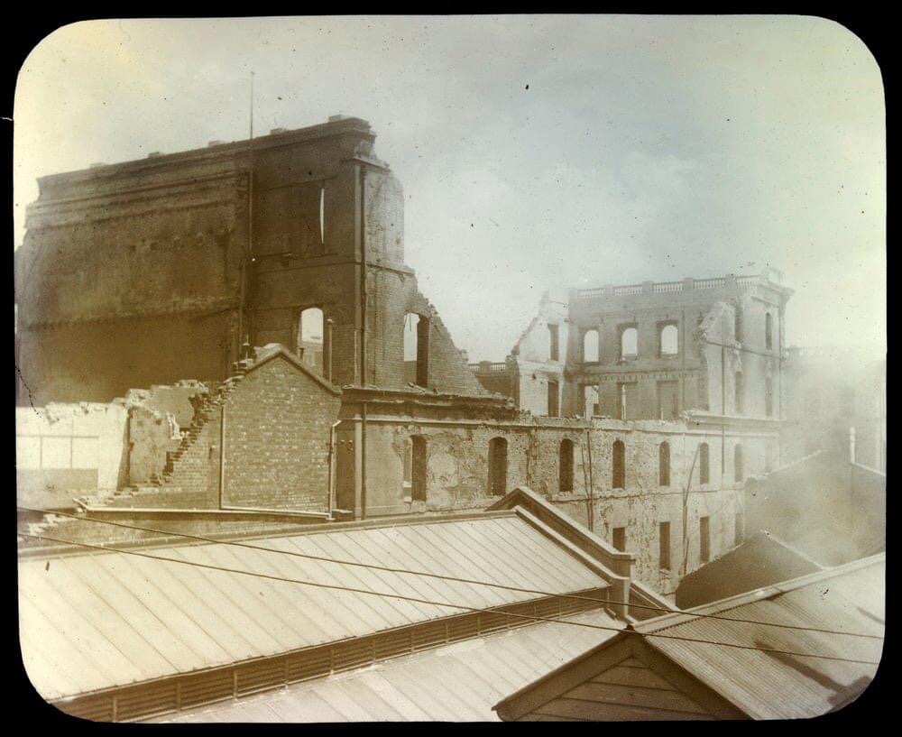 Crowds flocked to see the still smoldering ruins the next morning, when the whole area looked like post-war berlin, since the external solid brick walls largely survived. The State Library has a great collection of little seen photographs of ‘after’.