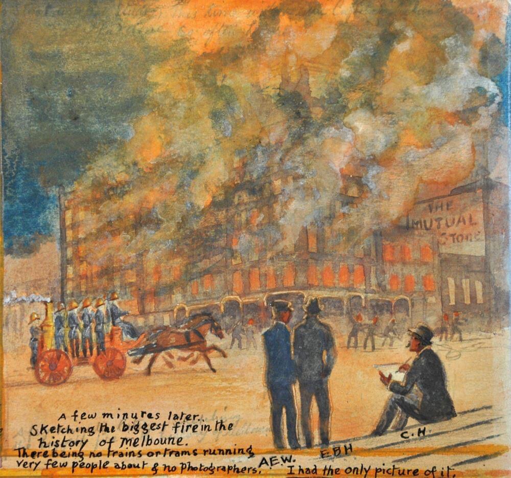 The only building to survive within the inferno was the Mutual Store, built in 1891 with steel window shutters and an external sprinkler system. The most spectacular building to succumb was Fink’s Building, a 9 storey ‘skyscraper’ built just 8 years before on the corner of Flinders & Elizabeth (surprisingly most walls would be retained and reused, minus the top four floors). The fire helps explain that many buildings in the block date from around 1900, especially in Flinders Lane, notably Ross House, built as a replacement Sargoods warehouse in 1899 (which went through to Flinders Street). Photos @library_vic, the ones with titles from #MelbournePunch via FB, the watercolour is by Charles Hammond, from 3am, for the Weekly Times, plans from Fire Services Museum.
