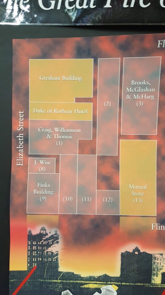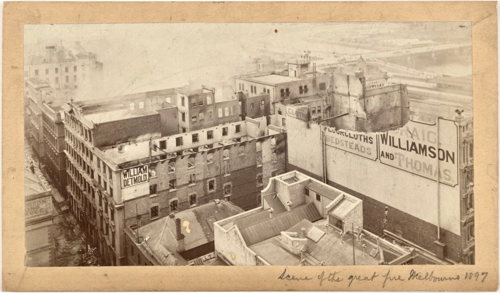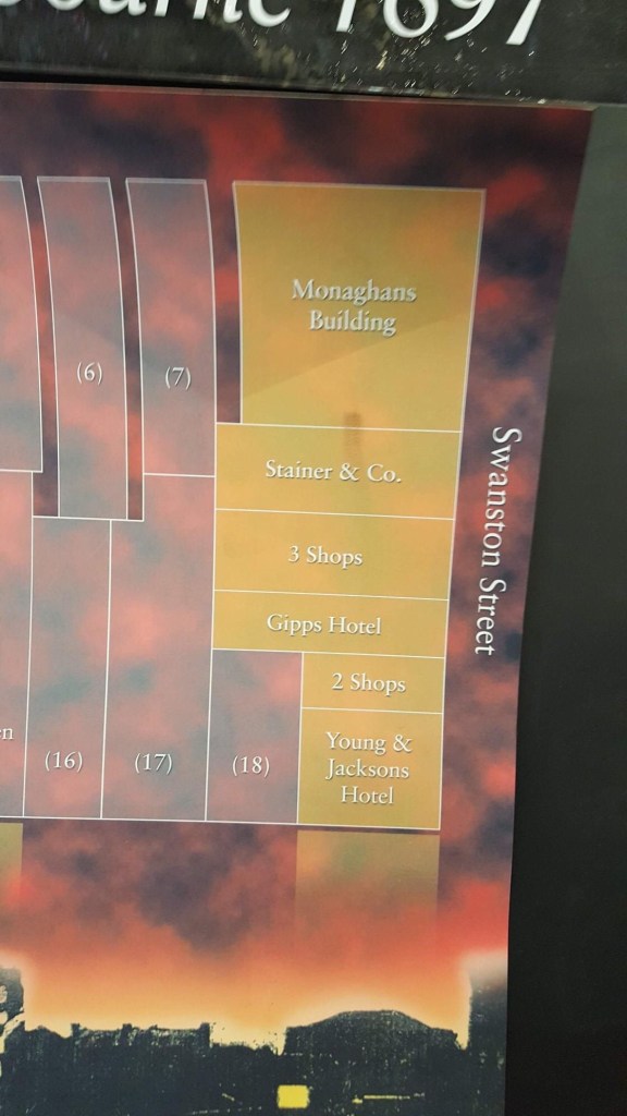 The Great Fire of Melbourne in 1897. One of the biggest things to happen in the CBD, but largely forgotten. Starting in the giant Craig Williamson Department Store on Elizabeth Street in the early hours of Sunday November 20th, it soon grew to destroy nearly the whole block between Flinders, Elizabeth, Flinders Lane, and Swanston Street, 17 buildings in all, stopping at the backs of the Swanston Street buildings – we nearly lost Young & Jacksons (where they rescued the beer barrels just in case).