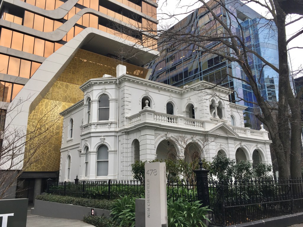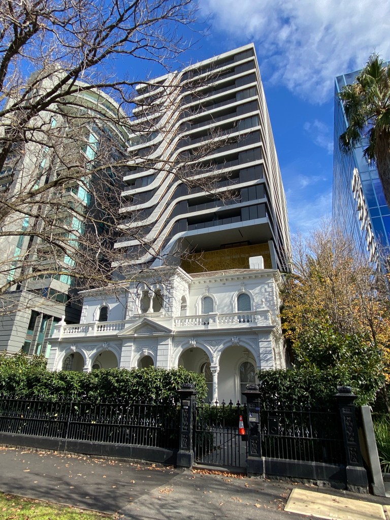 Charsfield, St Kilda Road, 1889, designed by #CharlesWebbArchitect for Alfred Hodgson, who ran successful men’s wear business. This one built a bit closer to the street than others, and looks like the middle bit should have had a tower. It’s one of the 13 mansions left on St Kilda Road and Queens Road, and like almost all the others has recently lost its rear wing to make room for a tower, this one much too close; it looks ok close up but just step back a bit and the gold scoop behind is distracting rather than complimenting, not to mention the tower, which is by @rothelowman in their Zaha Hadid style. In fact on second thoughts I don’t like it at all.