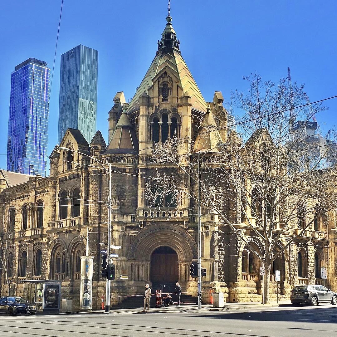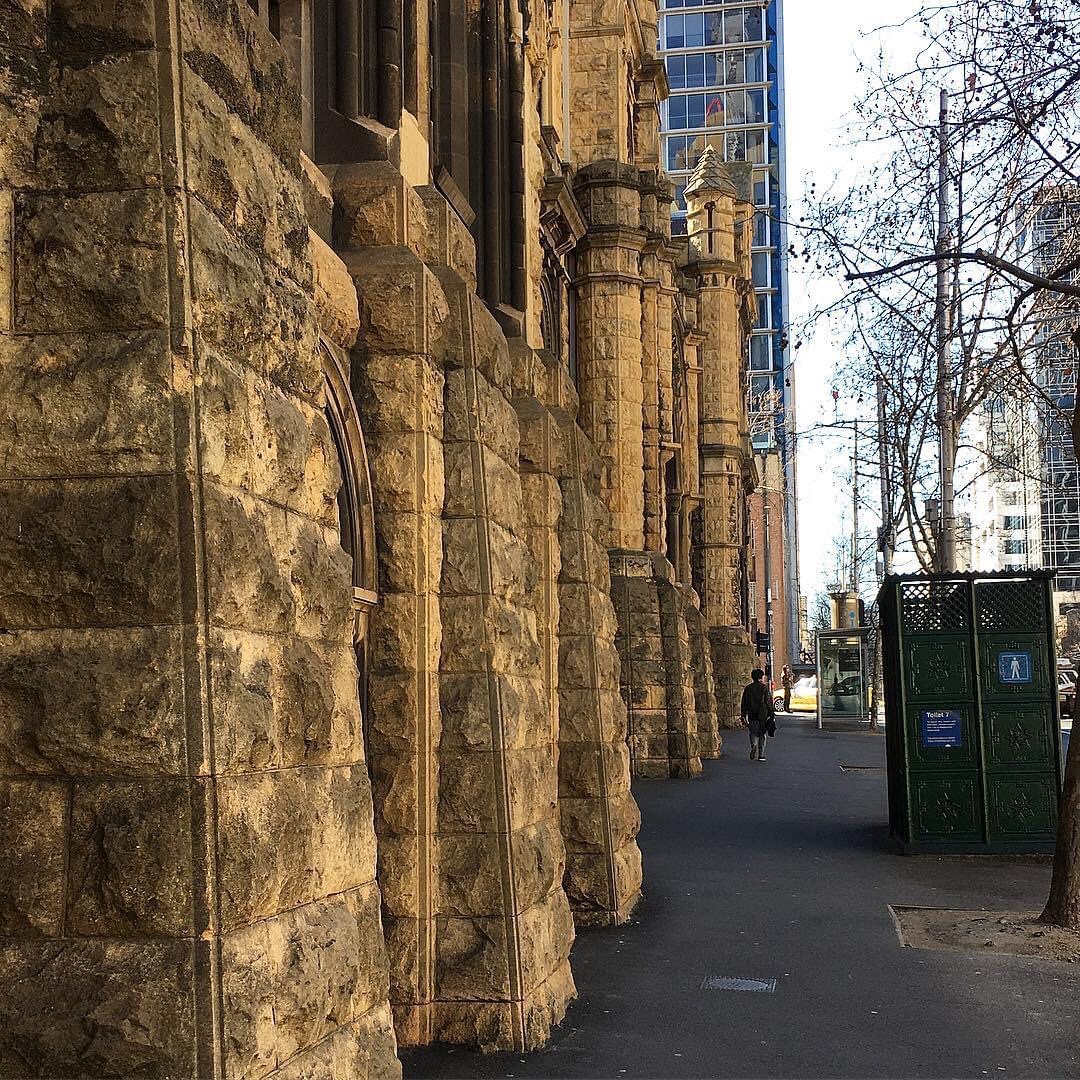The wonderfully #dour but so #hardtophotograph former #MagistratesCourt. Built 1911-13, designed by #GBHAustin of the #PublicWorksDepartment in a very unusual ‘French Romanesque’ or Norman style, complete with clustered turrets and a chevron patterned copper roof. Matches the style of his Watch House next door from 1908, but that’s in render. The roughly stone also works well with the 1890s RMIT building 1 on the west side. In part sunlight, I still hard to lighten this up a lot, until I realised that you can’t really lighten up stone that’s gone black. It’s Batesford #limestone, which I thought for a long time just need to be cleaned, but maybe that’s it, forever. It’s now part of @rmituniversity 2021: they’ve just cleaned the exterior, I’ll have to go back