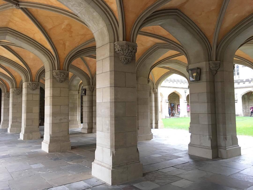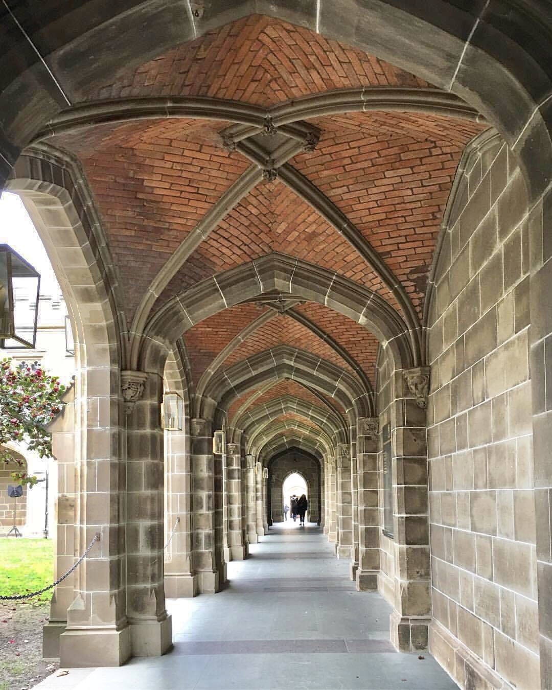 The original #cloister at #MelbourneUniversity. In the middle of a huge site, it started off as three wings, built 1853-57, designed by #FMWhite (who was still around in 1888 designing huge city office blocks). Always lovely to walk through, love the brick #vaulting. But did you know the wonderful bit of #cloister at the south end was built in 1970, completing the #OldQuadrangle as intended, 113 years after it was started. Love the orange textured render (which I guess is the colour of the brick in the original bits). Designed by #MelbourneUniversity staff architect #RaeFeatherstone who had done a number of modernist towers on the campus, though actually they have stylised cloisters come to think of it…