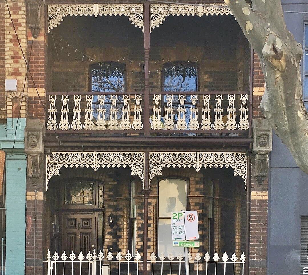 Great set of #polychromebrick #MelbourneTerraces in #PeelStreetCollingwood. The pair of #shophouses have odd huge brackets, a wild huge pediment thing and what look like chimneys but arnt. Peel street has a number of ex-shops scattered down its length, perhaps once was it was almost an extension of Smith Street shopping, but possibly they were built c1890 just in time for the economic bust, and maybe never even got leased.