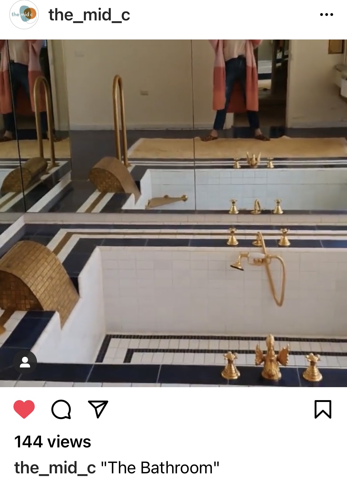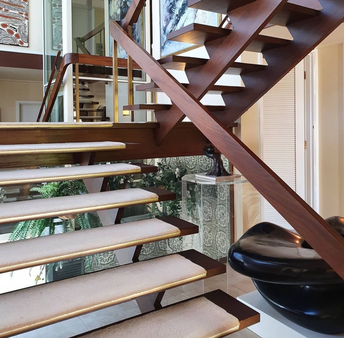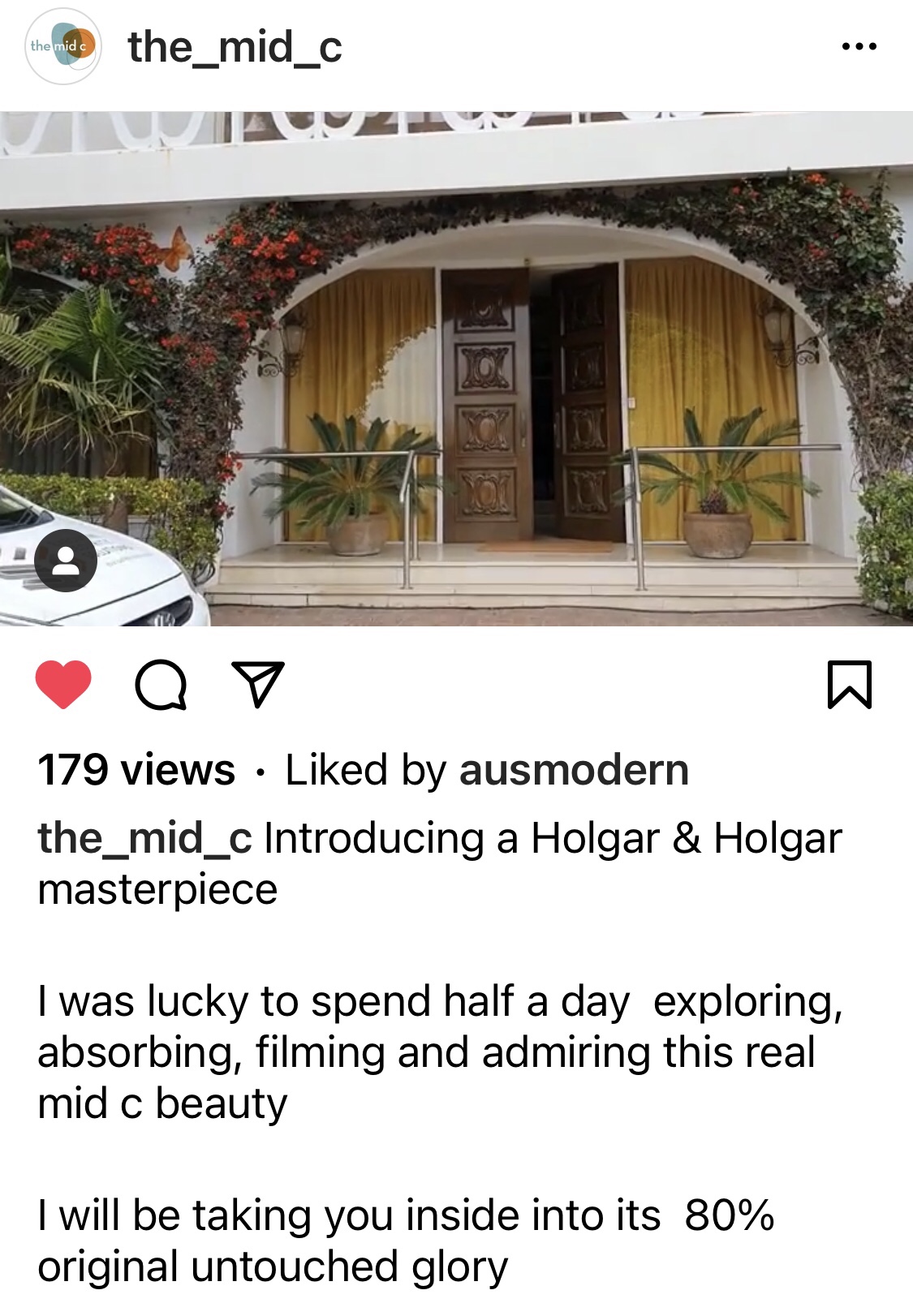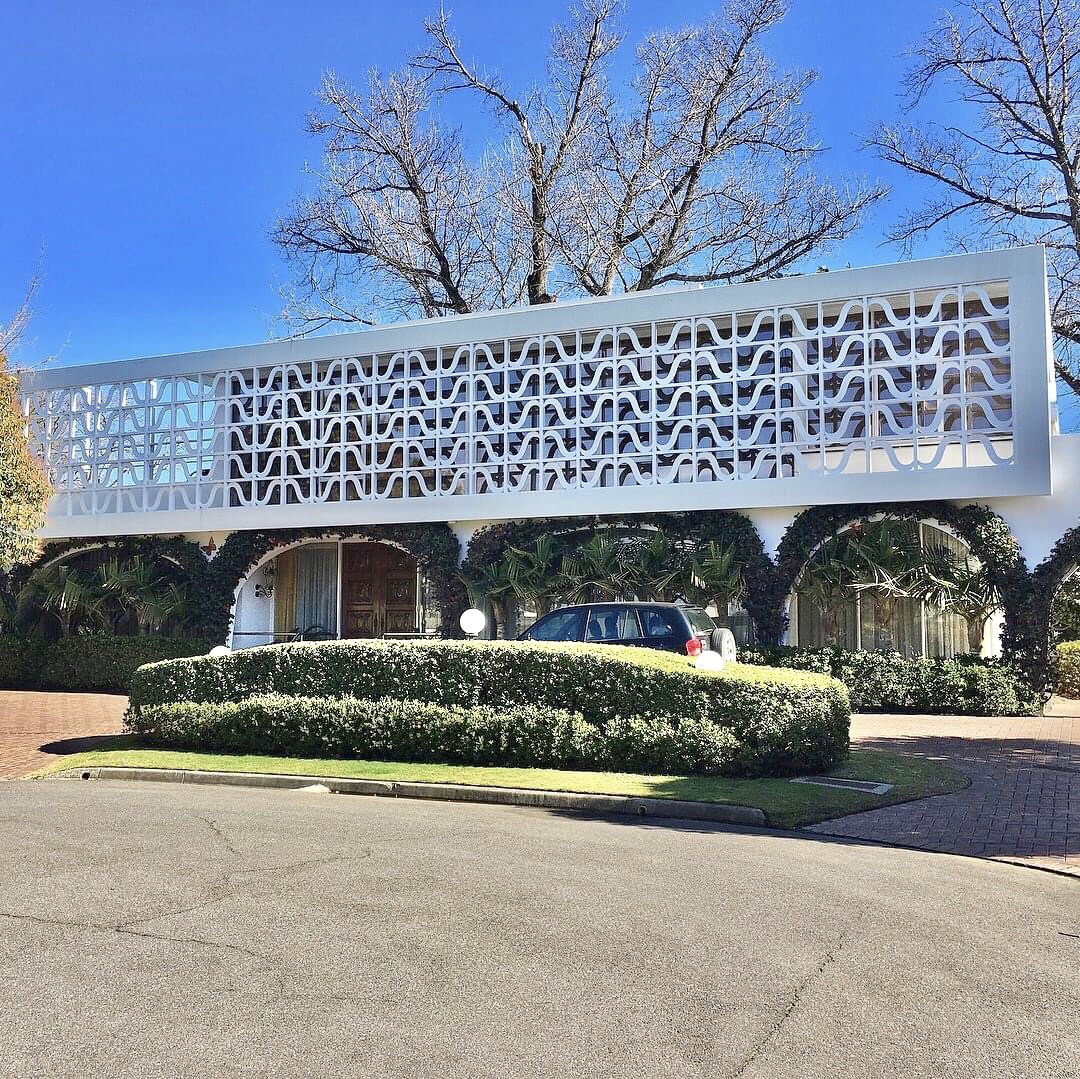 2021 update : Alan apparently passed away last year, and the contents were sold off in November; @the_mid_c bought a painting and got to go inside when she picked it up – some stills from her videos. Lovely 60s timber stair, a bar at the rear, a room surrounded by arches with a Perspex roof, a bathroom with loads of gold tiles and fittings, and the pool has swirly tiling, complete with a butterfly. 😮 The house hasn’t come up for sale as yet (or maybe it was a private sale) and unfortunately it isn’t #heritagelisted.