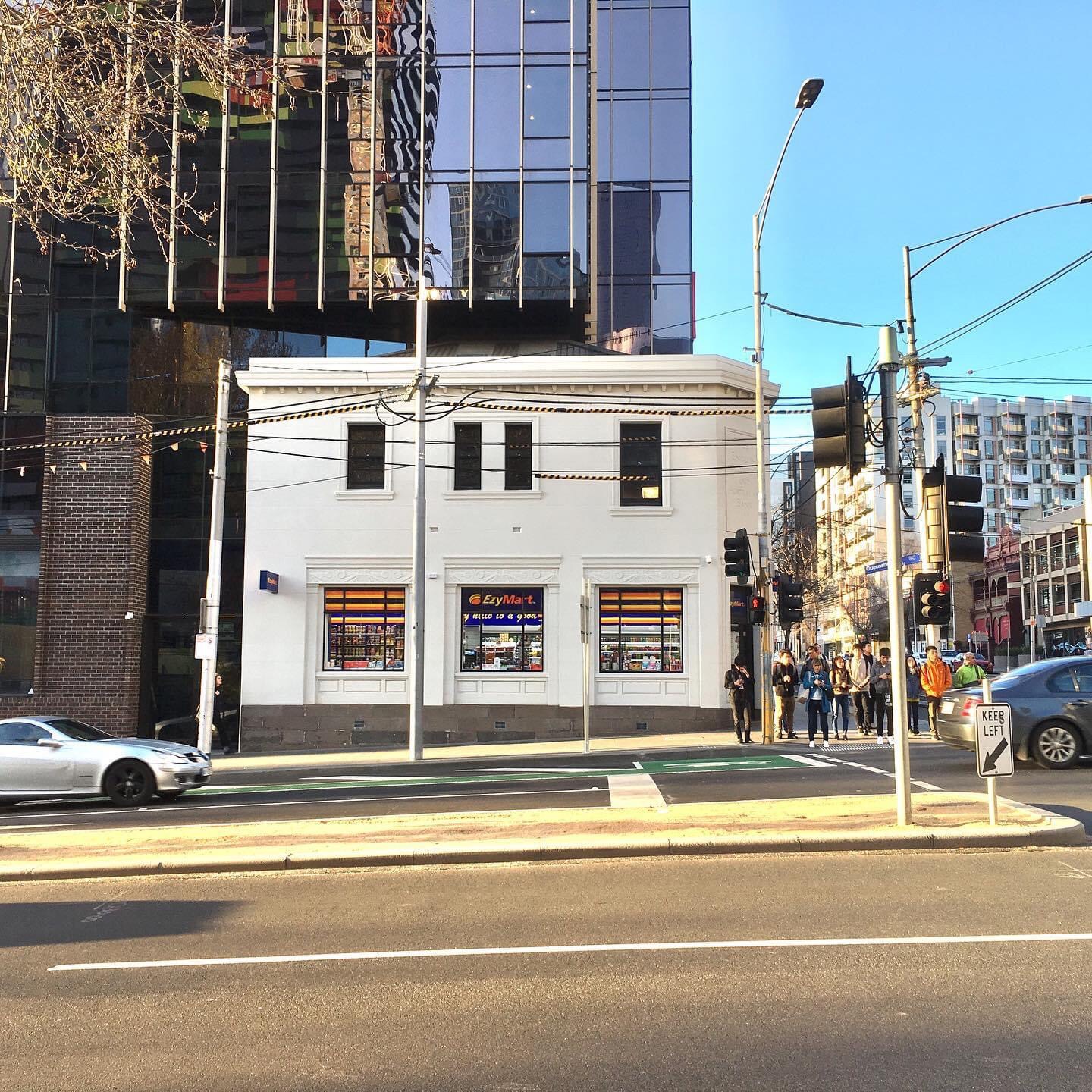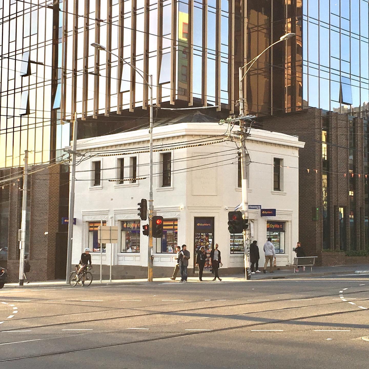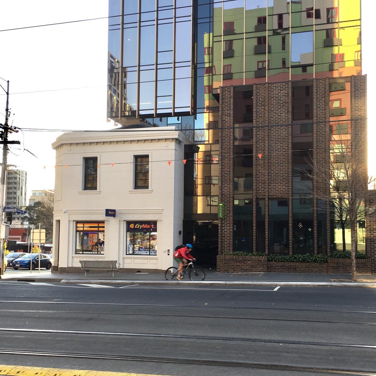 What were they thinking ? I mean the architects and I presume VCAT that let this happen. Gotta be the worst example of #facadism in #Melbourne. You can see they kept bits of roof, but to no effect, very small setback on one side, bigger setback on the corner, but the scale of the new completely dominates. The dark brick base doesn’t help, it just disappears into the tower. It’s Urbanest #studenthousing, in #SwanstonStreet, designed by @hayball_arch.