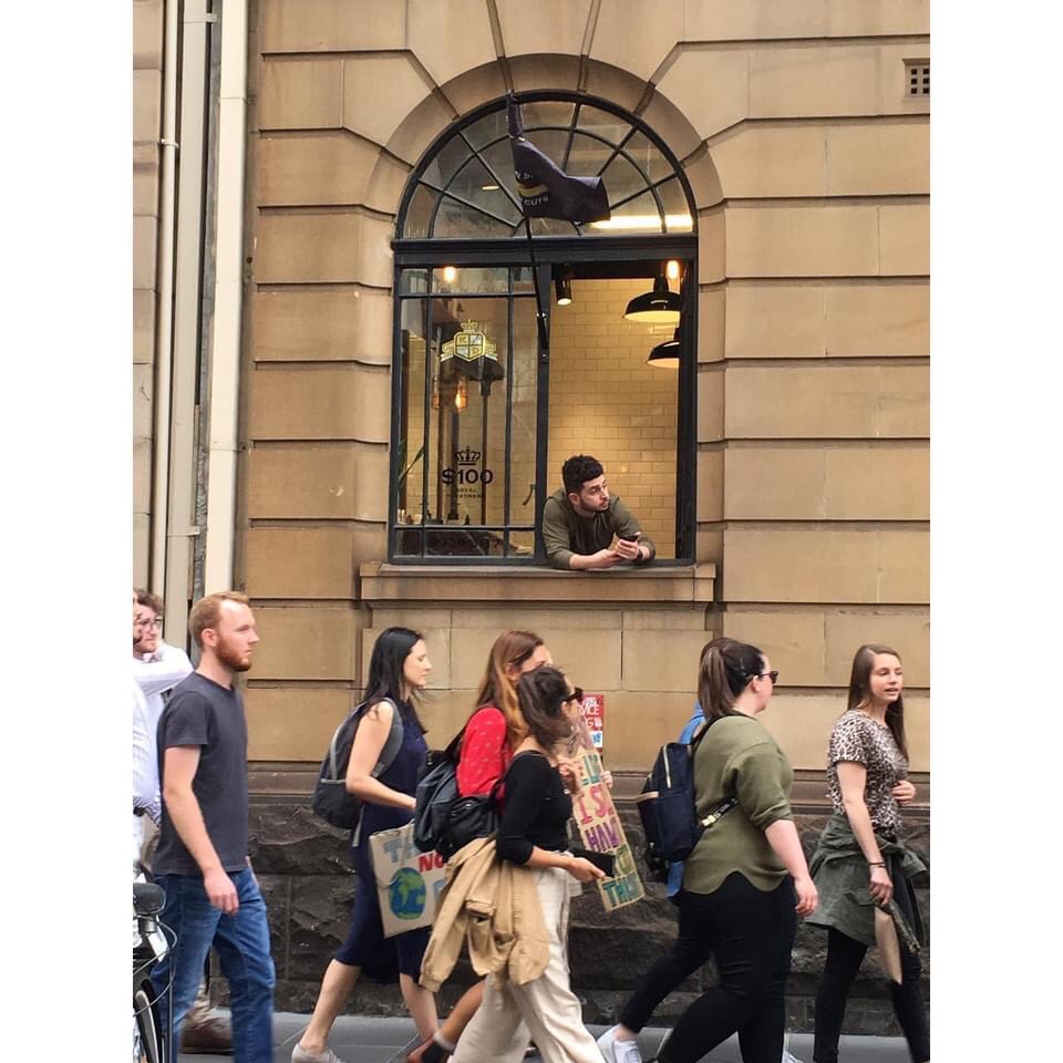 Hanging out for a #protest, in the window of #VictorHorsleyChambers, in the #parisend of #CollinsStreet, 1924, by #BlackettAndForster – a rather nice bit of #GeorgianRevival, hard to see through the trees #tramstop etc. Actually I think it’s more like Victorian Revival, not that there is such a thing, but the elements are pretty much from #VictorianMelbourne, but in stone, and not as ornate.