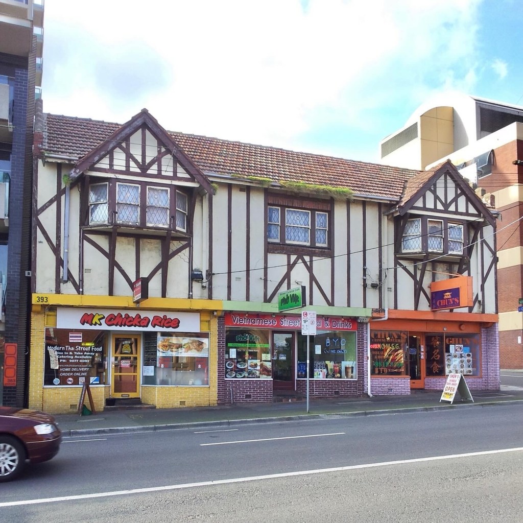I do love the #TudorRevival shops scattered about town, this one in #BurwoodRoadHawthorn quite interesting, being all #halftimbered, with propped bay windows, more like the medieval originals than many others – I tried to get it #heritagelisted when @cityofboroondara finally protected the glenferrie rd shops back in 2011, but this was disconnected by two wide non-listable places, so didn’t make it – and now of course there’s a proposal to replace it 😢 It’s called Arcade, though it doesn’t have an arcade in it; it’s by @ascuiandco, and at least the flats seem to be spacious, with big balconies, and it steps back a lot, which I good for the north sides of streets, but rarely happens. Photos from 2015. Update: streetview shows it being demolished in Dec 2021, and I’m told construction is now well advanced. And people still remember Penang Coffee House that was here a long time ago.