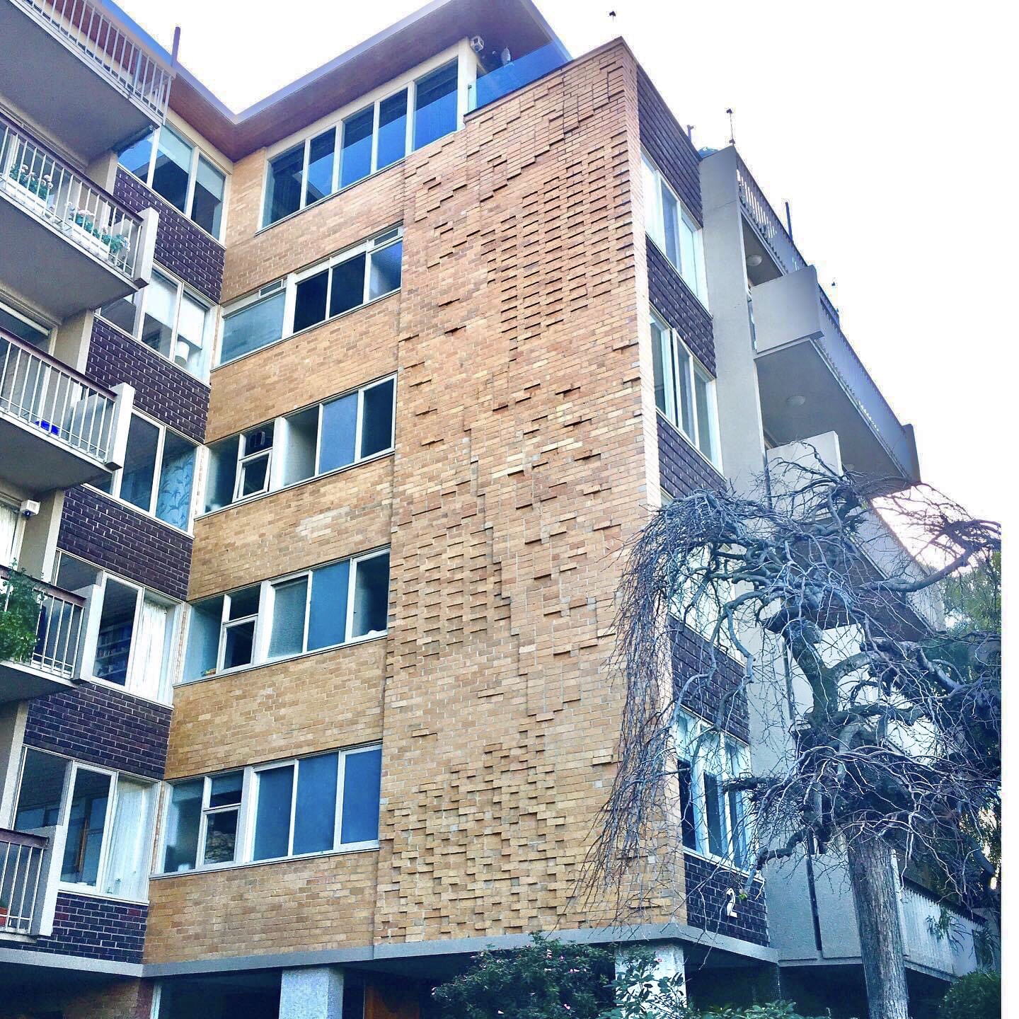 Down a #culdesac in #Toorak i found this ! #HeyingtonGardens in #TheodoreCourt is apparently by #ErnestFooks, 1963. Great brickwork, patterned spandrels, lovely tiled entry. I would have got more /better photos but an older lady with east European accent emerged from her first floor balcony to tell me ‘you must get permission’ – I said I was admiring the architecture, usually works, but she wasn’t dissuaded; I said ok I’ll get permission, but I was fibbing.