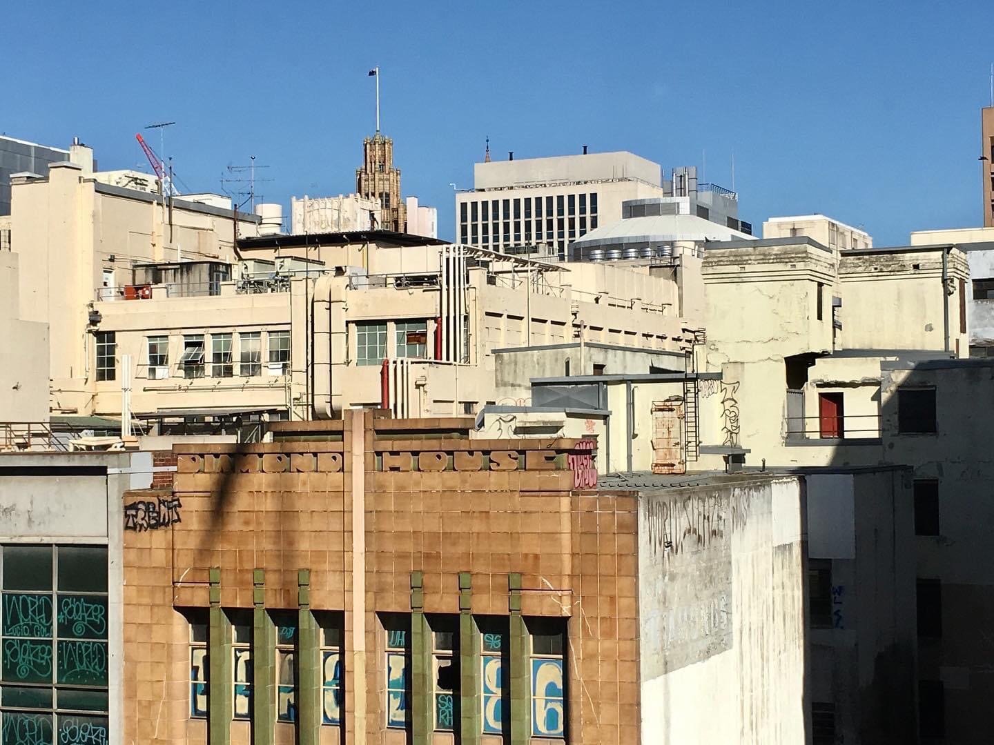 A #roofscape created by the #132ftheightlimit, imposed in 1916, and only ‘uninhabited towers’ allowed above, eg the #ManchesterUnity spire in the distance. So glad it was reimposed in 1982! As 40m. And that not much went over it in the 50s-70s when it wasn’t there. Lucky city. View from the Myer Menswear 4th floor windows, over some buildings that are below the limit. I like that you can also see the backs and sides, they might be any shape behind, eg #LondonStores is actually U shaped, with a long tail, the top of which was the caretakers house. (not sure what those big letters all about).