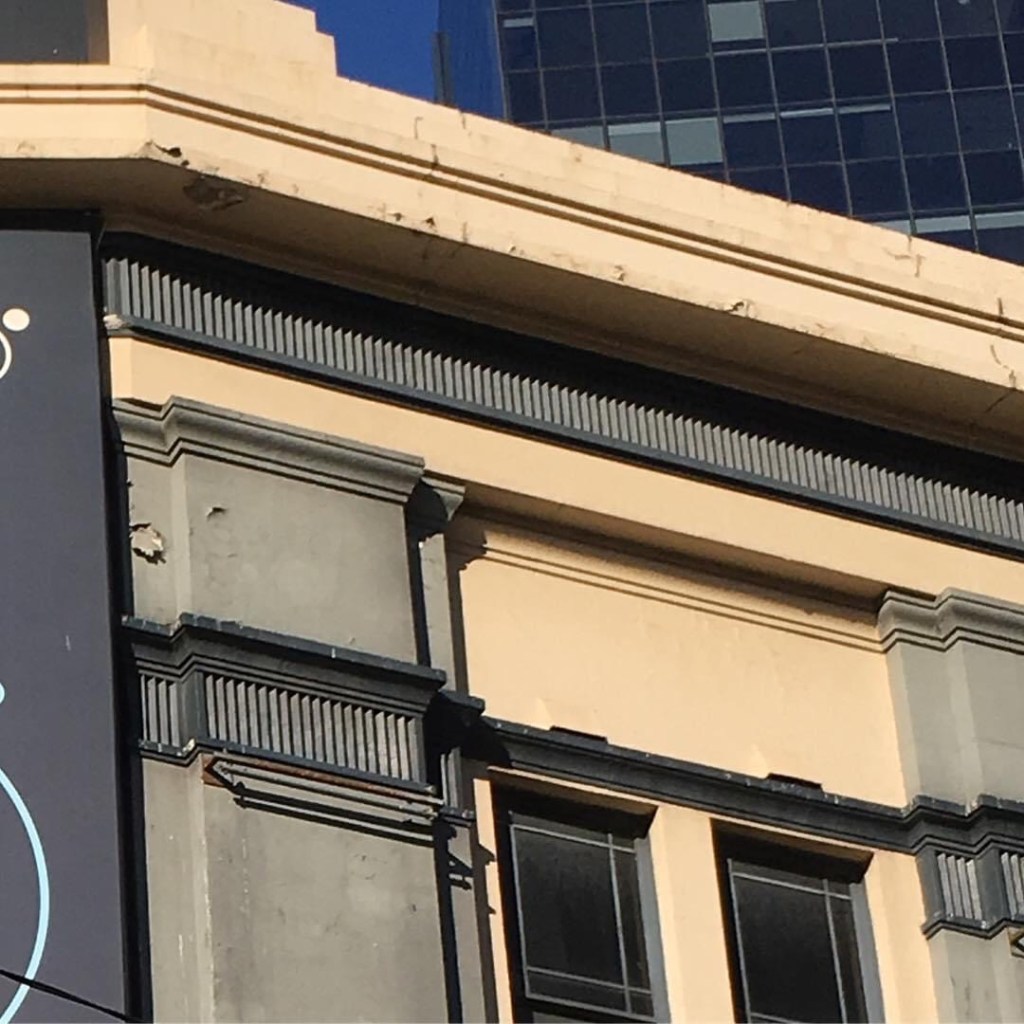 The not amazing but not nothing #QueensBridgeHotel, 1927, #PeckandKempter, a nice #strippedclassical design, rather prefiguring Art Deco, and probably not long for this world. [2021 update: after a battle at Panel this did in fact get #heritagelisted late 2020]. Pretty sure way back in the 80s it was #heritagelisted, but it dropped out when #Southbank was transferred to the #CityOfMelbourne in 1997, and Southbank has only just been reviewed (finally); it’s recommended for listing, but the way-too-bulky 90 floor #CrownQueensbridge that would demolish it and the three adjacent buildings got a permit from the Minister early last year despite a lot of issues, but then again, they can’t sell the apartments, so it’s on hold. The hotel had a brief life as a giant dance club in the 90s; bad things happened, and it got closed, been empty ever since. [the permit for the hotel was not renewed when it lapsed in early 2019, yay !]
