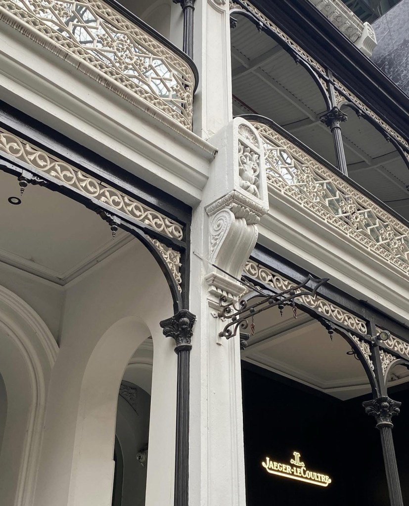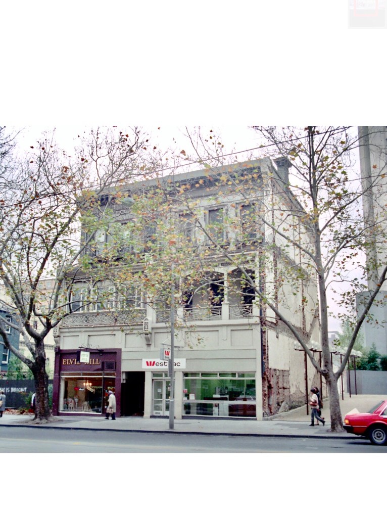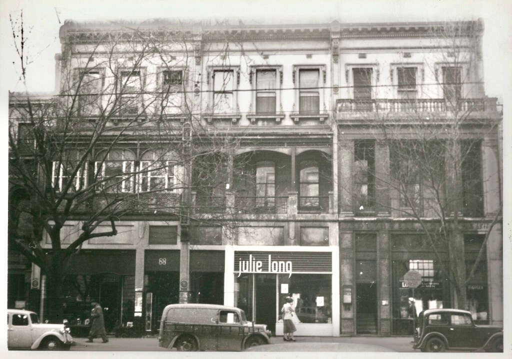 Great photos from 1984 by Graeme Butler of them, after the demolition and before restoration, and another from 1956 showing all three but how very altered the demolished one was. In about 1990 the ground levels of these two were restored (sort of, since there’s shops in them, and ground levels were originally higher, I think). So only the #castironlace of the upper floor of no 88 is original. But the reward wings are intact, which is unusual in the cbd.