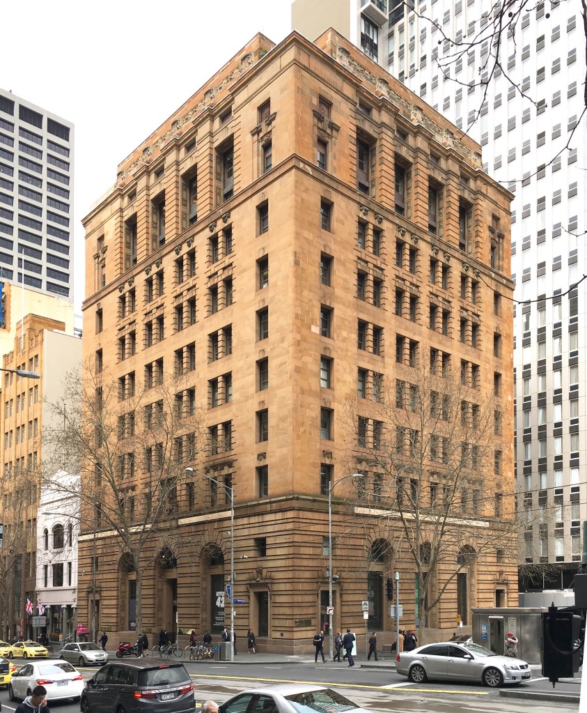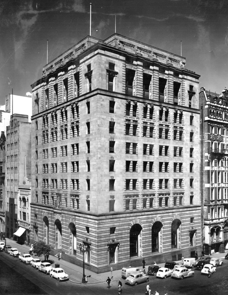 Repost 2017: The old (second) #AMPbuildingmelbourne, Collins corner Market Street, 1931. I can see why it’s described as ‘cubic’, but you have to be at the right angle, a function of being built up to the #132ftheightlimit. Suitably massive for an insurance co, it’s very fine, all Sydney sandstone, stylised classical, with a hint of #ArtDeco massing, you could call it #CommercialPalazzo, or if you’re in the US, Beaux Arts (maybe). It was designed by #batessmartmccutcheon, now just #batessmart, and won the Street Architecture Medal for 1932. Great carved window reveals, some lines about Fawkner’s pub once on this corner, and the statuary group called ‘Amicus’, versions of which went above or on most of their buildings into the 60s. Hasn’t changed much since it was built, B&W 2950s via Facebook. The Insurance Hall inside was particularly big, and rather plain (old pic from @nationallibraryaus 1981), and now has mezzanines and bars and stuff so you can barely see the walls. The first AMP was 1891, one block east (gone) the third one, 1 1/2 blocks round the corner, built 1969, ground level altered. Update : recently the facade was cleaned, but not sure it looks any different.