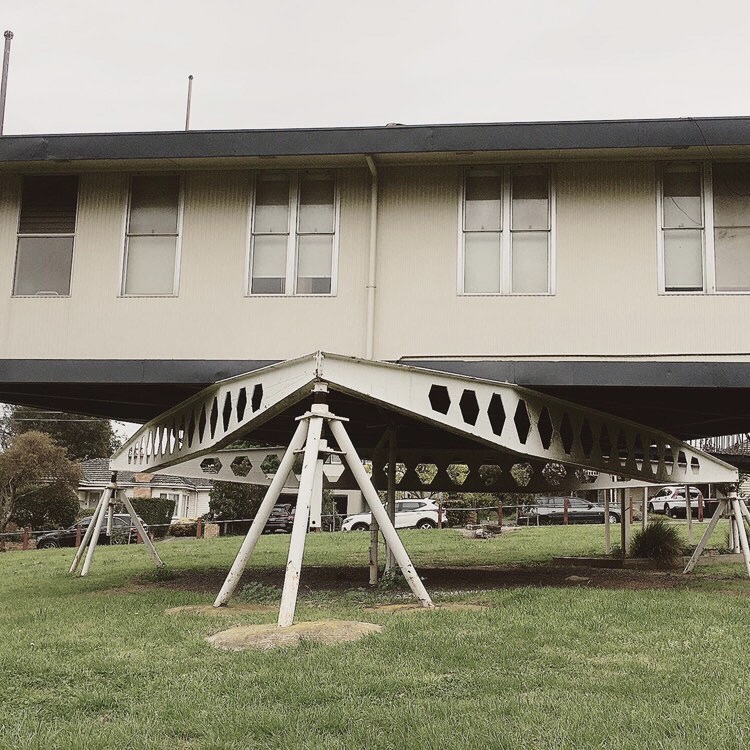 Rather unexpected to find this in a reserve in Essendon West ! (and thanks to @alisonmp for the pics). This was built as the Infant Welfare Centre in 1963 – the City of Keilor Engineer Garnet Price thought up this solution for the uneven ground, taking his cues from some of the 1950s experiments with unusual structure. It’s now the Emerald Street Community Centre, pretty intact, and locally heritage listed.