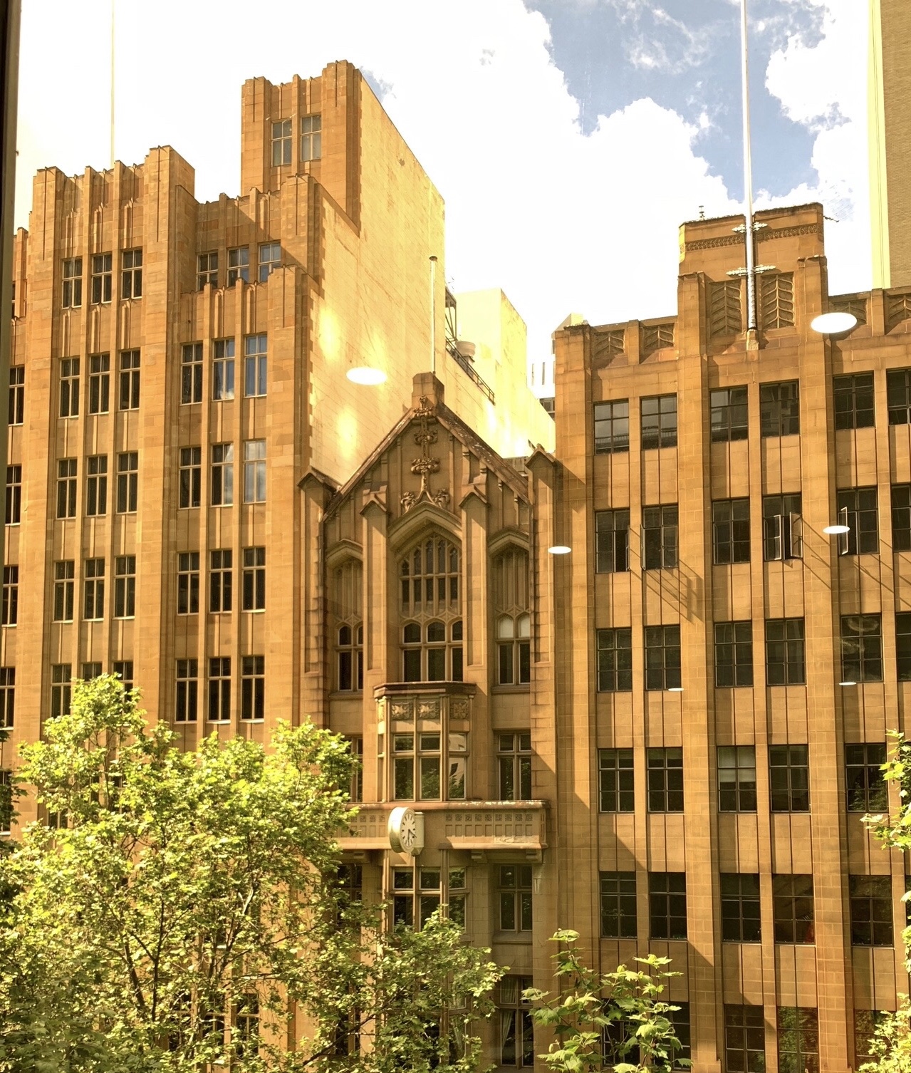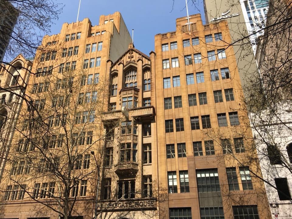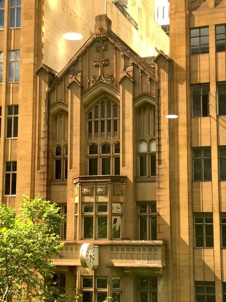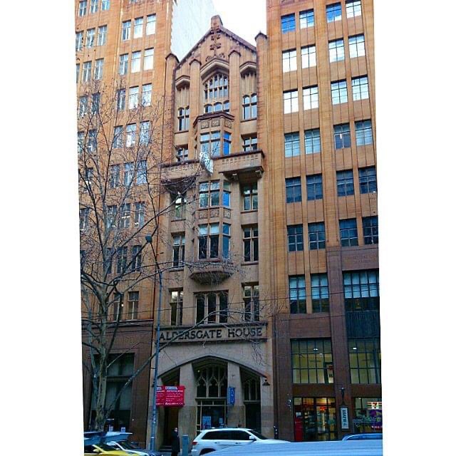 A Gothic sandwich in Collins up from Queen. In the middle, Aldersgate House (originally Colonial Mutual Fire Insurance, dont know when it became Aldersgate), built 1924 designed by #sydneysmithoggandserpell which would have stuck out from lower stuff until the almost exactly matching #decogothic vertically striped blocks built either side- Trustees Chambers, #AandKHenderson on the left in 1937, then Commercial Union on the right, 1943, #PeckandKemter & Dalton who were obviously told ‘make it look like the other one’ or just couldn’t be bothered doing something different. The two elevated photos thanks to Kevin Pierce via Instagram, Oct 2021.