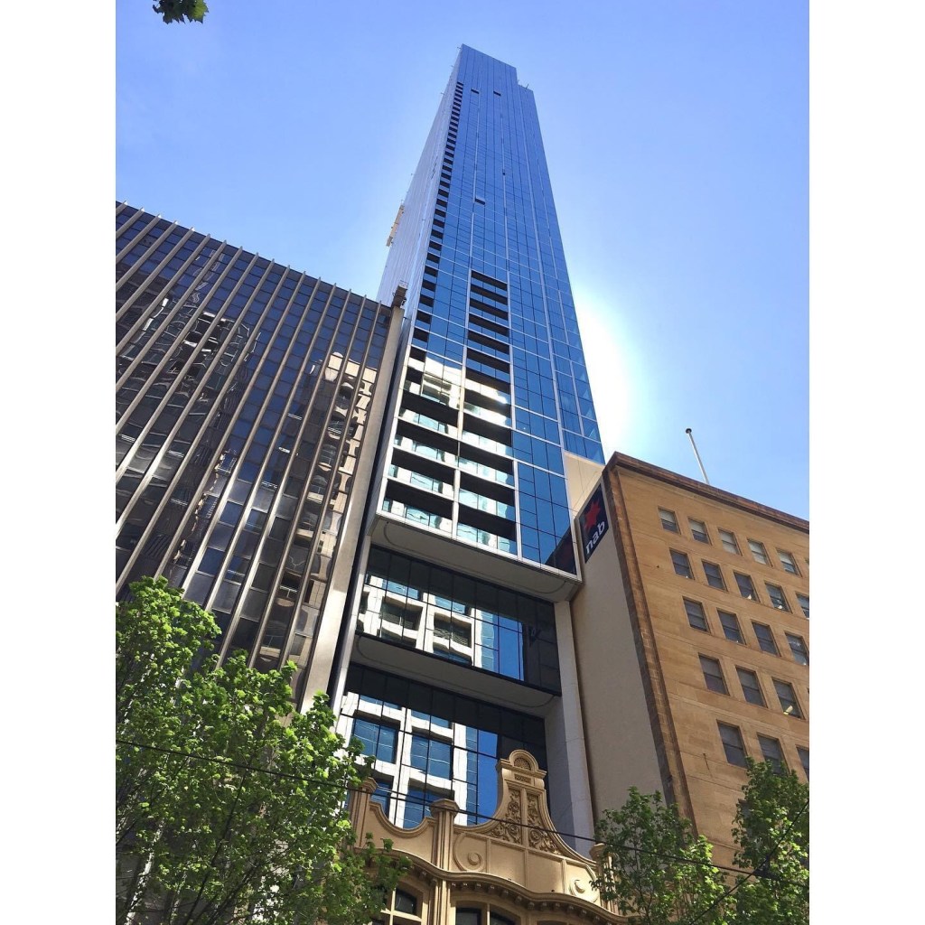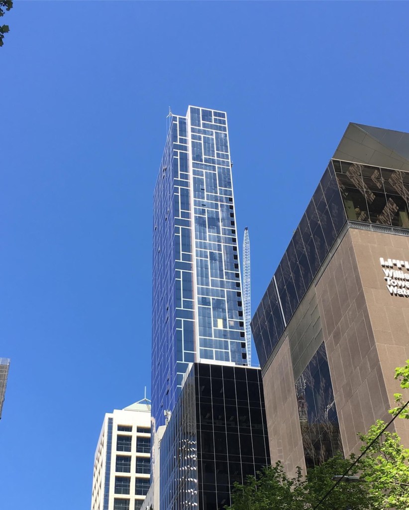 Collins House, just finished, 464 Collins, #BatesSmart, on top of the partly preserved #Huddartparker building – I’m quite surprised to see that the stepping back then forward again, normally a no-no, works in this case- prob because it’s such a high gap, and effectively puts the tower above the National Bank next door (they bought the air space, so it’ll never get a tower on top), plus the stepped levels are very plain, just background. The setback is 6m for 4 floors then 5 for 2, then 4m – this got a permit in 2013, and since then the rules make the min setback 5m, so they got an extra 1m for the top 60 floors.