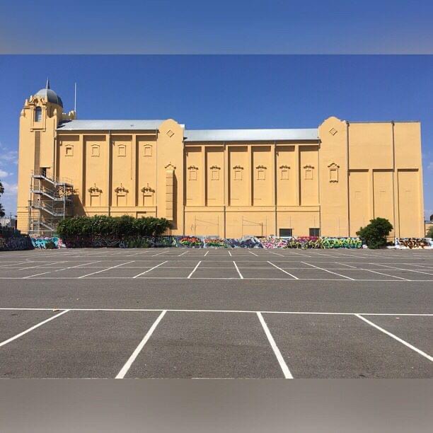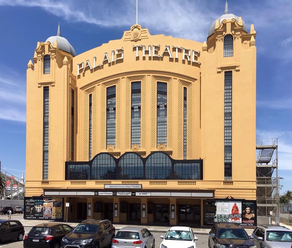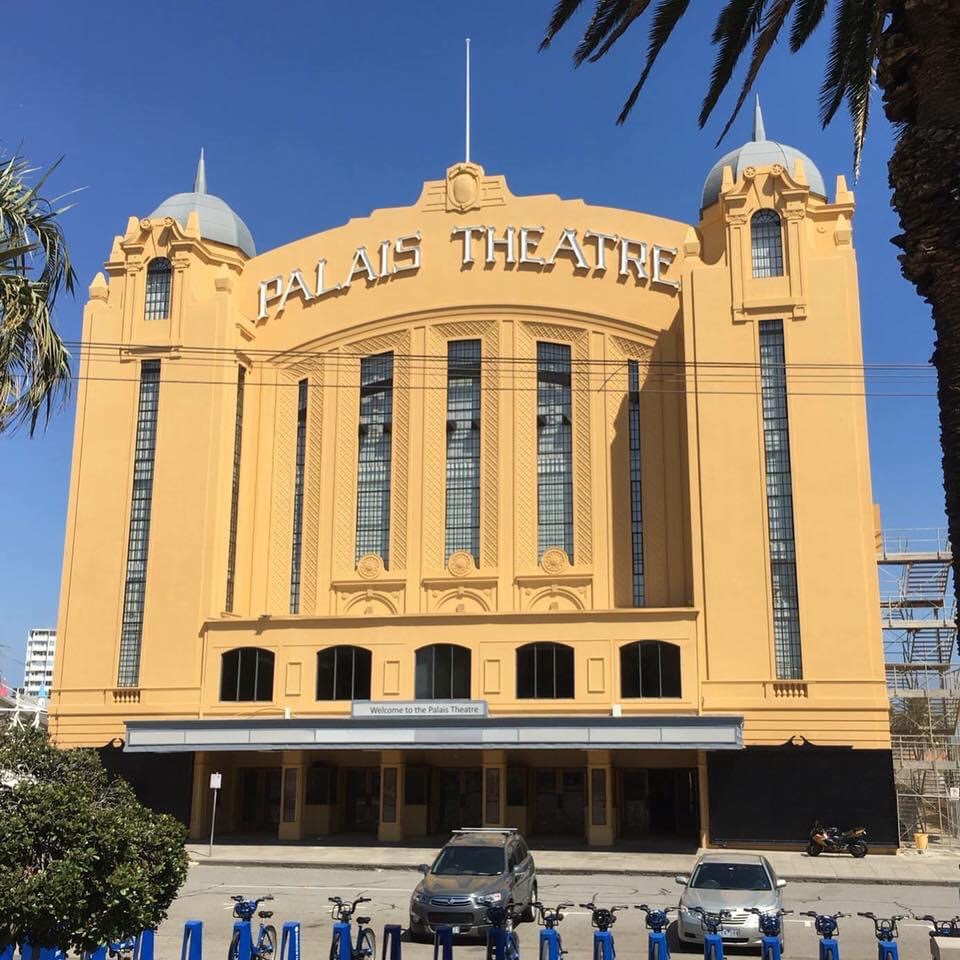 The Palais Theatre looking resplendent in its new #ochre #colourscheme (the original or at least the earliest they could find). The metal tray sign with its new LED lighting replacing the original neon also repaired. Architect was #HenryWhite who did many live theatres across Australia and NZ in the 1910s and 20s; this is his major #picturpalace, built in 1927. @ Palais Theatre