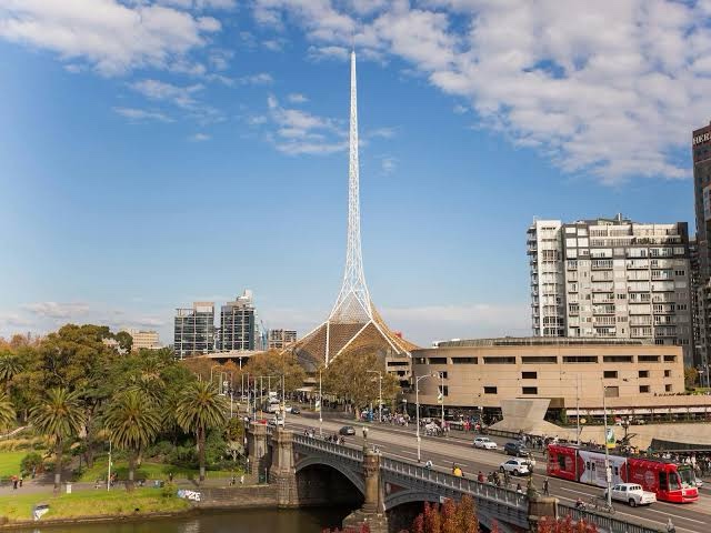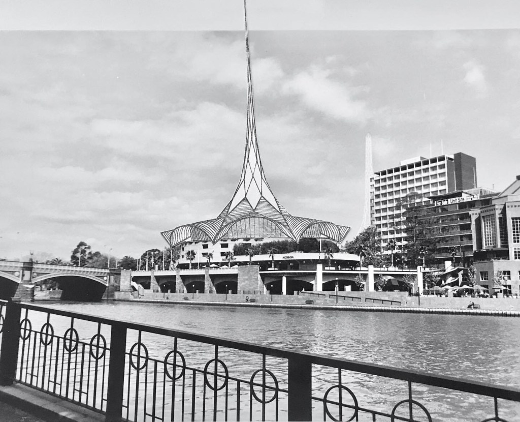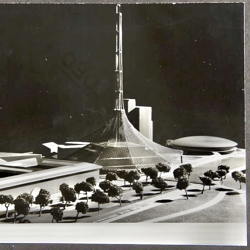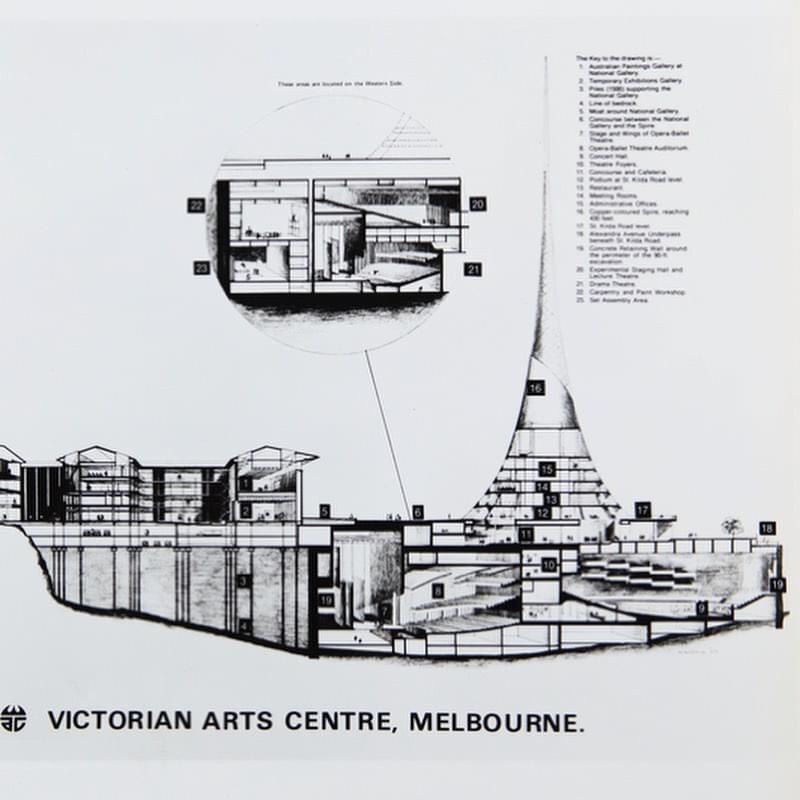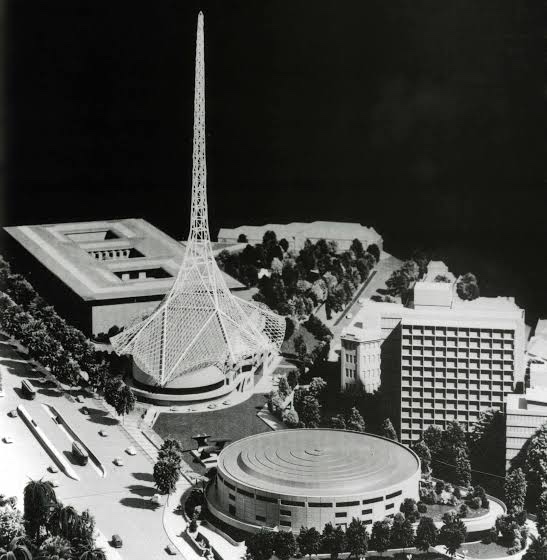 Repost 2020: We all know Roy Grounds’ Arts Centre spire was originally meant to be solid and copper, but did you know there were in between ‘mesh’ designs ? Found a research paper I did in 1991, looking at the evolution of the design – the original neat 1960 proposal (pics 4-6) had a 2000 seat opera theatre, 1000 seat concert hall and 300 seat theatre, all entirely underground! By 1970 each theatre had grown, plus the ground was marshy, and a solid spire would be heavy, so it was decided to put the 2500 seat concert hall in a separate structure on the rivers edge (connected with a platform over city road), which Grounds initially tried to hide or at least keep very low (yes one was called the flying saucer design). The theatres building was now partly out of the ground, and larger, so he came up with various ‘see through’ spire designs, ending up with the ‘tutu’ space frame spire in about 1975 (last pic). In the process the urban prominence of the spire was lost, which was the point of my paper. The photos can now be found in the Performing Arts Collection.