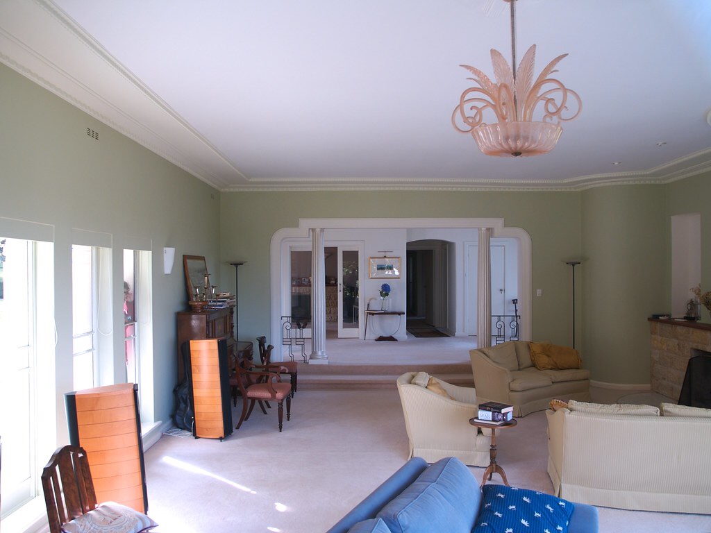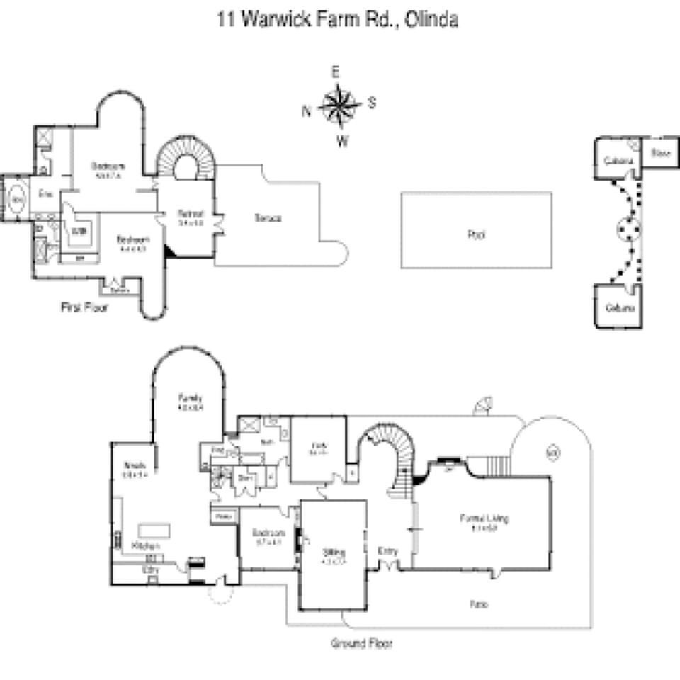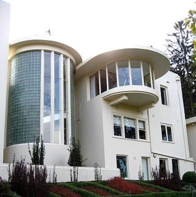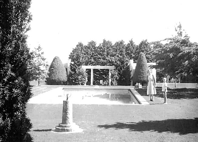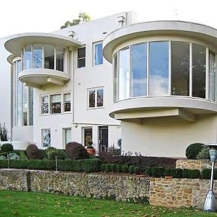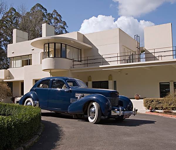 Repost 2017: A stylish movie set ? No, it’s a house in Olinda ! #Dalcrombie was built in 1939 for Earle Coles, of Coles & Garrard, and originally named Llanhydroch; it was designed by #JEsmondDorney, who did a lot of really great Deco flats, especially in Elwood. So many projecting #semicircular elements, a fave feature of Dorney’s later 1930s work, sticking out from the flat roofed main rectangular volume, on different levels and wildly cantilevered, and the stairs are also in a semi-circular drum. The lounge by contrast has huge long rectangular windows opening onto a terrace with only a corner post between them. The possibilities of #reinforcedconcrete. Along with Burnham Beeches, also in the Dandenongs, and Carlaminda in Toorak, this is one of the best Art Deco mansions in Victoria, though not well known. Note the biggest lower projecting window on the right is not original but part of a matching 80s addition. Inside there’s great wrought iron on the stairs, a fine sandblasted shark window, and a pair of (not very Deco) fluted columns between the entry and lounge, and outside a very classical columned screen beyond the pool. The first photo is everywhere in the internet, but was originally by Brian Scott for the NGV’s 2008 Art Deco exhibition in 2008 (featuring the car, a 1937 Cord 812 Westchester sedan), photos 2, 9 and the plans are real estate photos from 2003 (cant believe they’re still there), the rest Sandra Cohen Rose via Flickr from 2007, B&W photo is from acountryhouse.com blog.