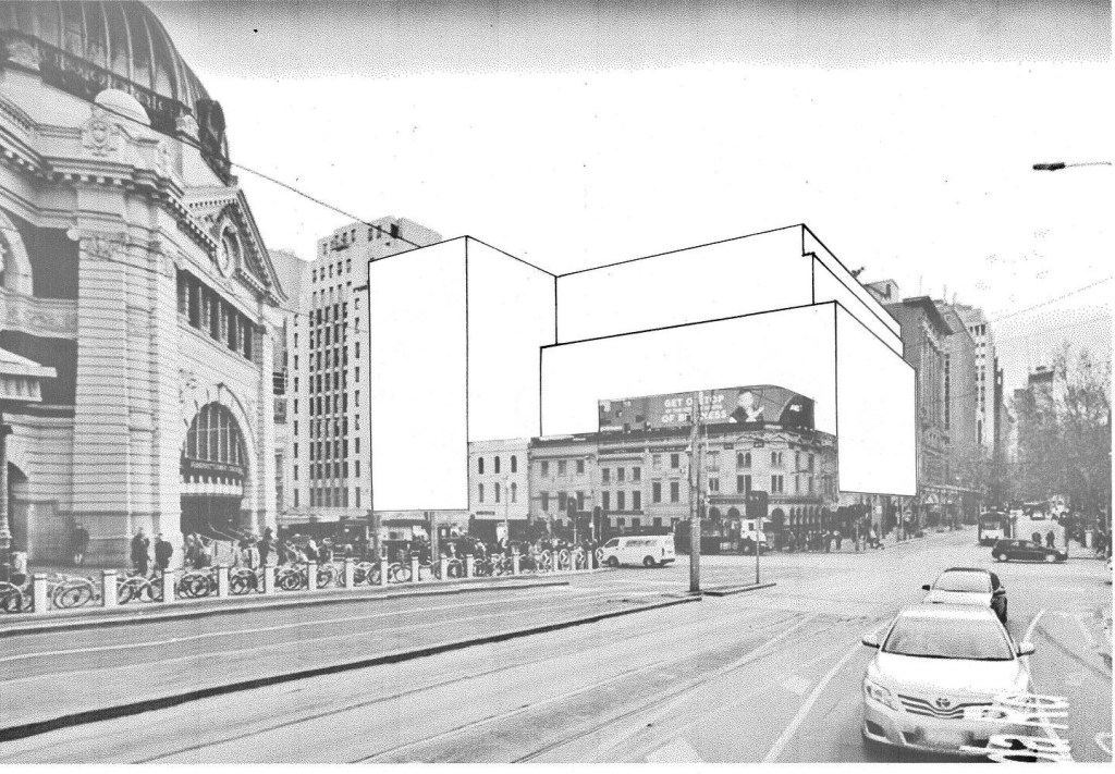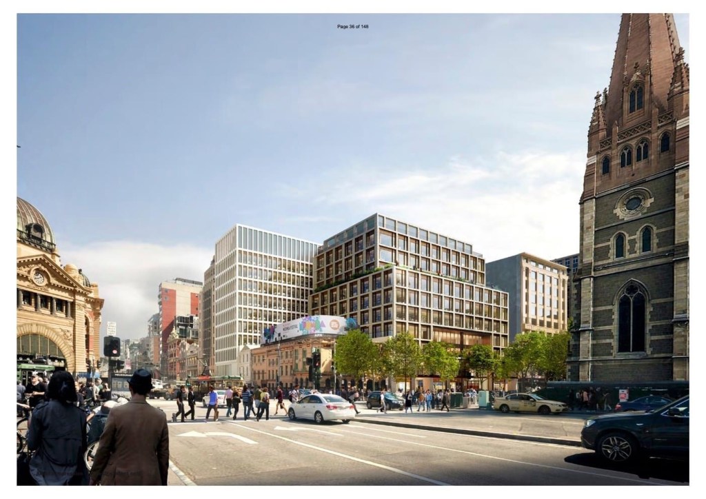 This is what’s proposed for the Melbourne Metro site behind Young & Jackson’s, and it’s my worst fear- a big gridded office block completely filling the allowable envelope (with shops and walk throughs at ground level). It’s nicely detailed in textured concrete and bronze, fine anywhere else, but this site deserves more than polite contemporary wrapping. It’s going to the City of Melbourne on Tuesday, but they can only comment, the final decision resting with the minister for planning Lizzie Blandthorn (who?). The CofM planners like it though, stating it has ‘exceptional design quality through response to context’ (??!!). There’s guidelines as well but I don’t see any mention anywhere of how important and visible the site is; nothing about being a city gateway, nothing about breaking down the mass, nothing about looming over Y&Js. There was to have been a library or gallery at first floor, but ‘subject to market conditions’. Nice to see the Neptune mosaic going back, but that’s the only positive. My design is at least varied – and note they don’t have a view from that angle along Swanston Street. The developers are Lendlease, the architects @hassell_studio, and the State Government owns the site. I’m not able to mount a campaign, but you could make a quick submission to the City of Melbourne’ Future Melbourne’ committee (Google that plus Agenda), and/or the Minister- I will be !