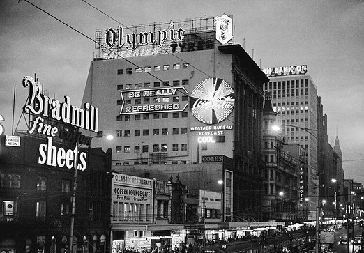 After they’ve finished the metro station entrance behind Young & Jacksons, the planning allows for a 10-12 storey building (up to the 40m height limit) wrapping right around (with a 6m gap next to the Nicholas Building). I’d much prefer we keep this view of old side walls intact, and allow just 3 or 4 floors, a nice arcade would do. But I also thought maybe you could make a new building fit in, by designing it with light wells, lift shafts and plain side walls, like older buildings around town. I’m also wistful about the neon signs that clusters here from the 40s-70s, so I’ve put some of them in too ! I’m doubtful a developer would do anything like this though. I’m half expecting a boring office block design to be announced any moment ☹️. My sketches based on streetview, the development envelope found on line, and last image is c1969, #AngusOCallaghan.