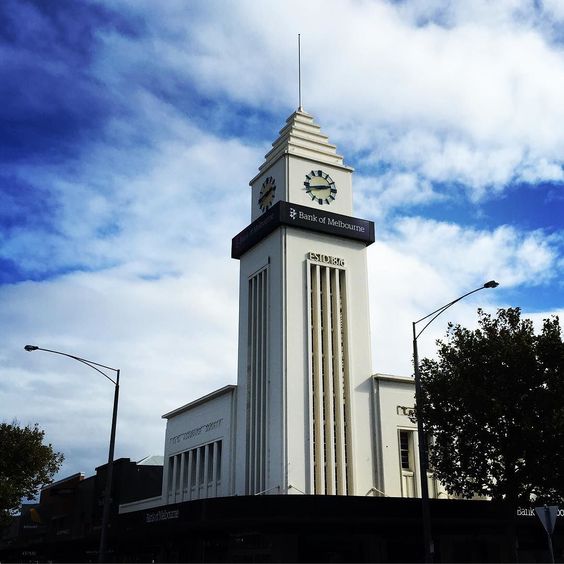 Hobart is possibly the most striking, with accentuated verticality, provided by fluted lines which burst through the cornice to create the base for the tall, slim clock tower and stepped top. Geelong however is a personal favourite, something I often passed on childhood county trips – this was partly because of the soaring corner tower, so much higher than anything in Geelong, but perhaps mostly because I hoped to see the mysterious mechanical figures emerge out of the tower to ring in the hour – but I was usually disappointed. I haven’t seen them for years, and now I read that they have been dormant for some time, and only started moving again this year, after Deakin University bought the building and refurbished it for student accommodation.[7] They restored the figures, which research tells me represent a farmer and his son, symbolically passing on the wealth of the land, which sit on a sliding platform that pushes slowly out a window at the base of the tower. Their arms go up and down to clang a bell on the hour, though I seem to recall it as a little more exciting than that ! Locals sometimes call them ‘Dad and Dave’, and whenever Geelong makes the finals they’re dressed in club jumpers and scarves.[8] (you can watch them in operation in a YouTube video- just google Farmer and Son, T&G building, Geelong). These are reportedly the only mechanical clock figures of their type.[9]