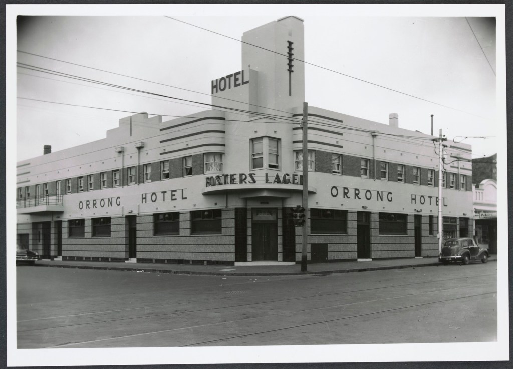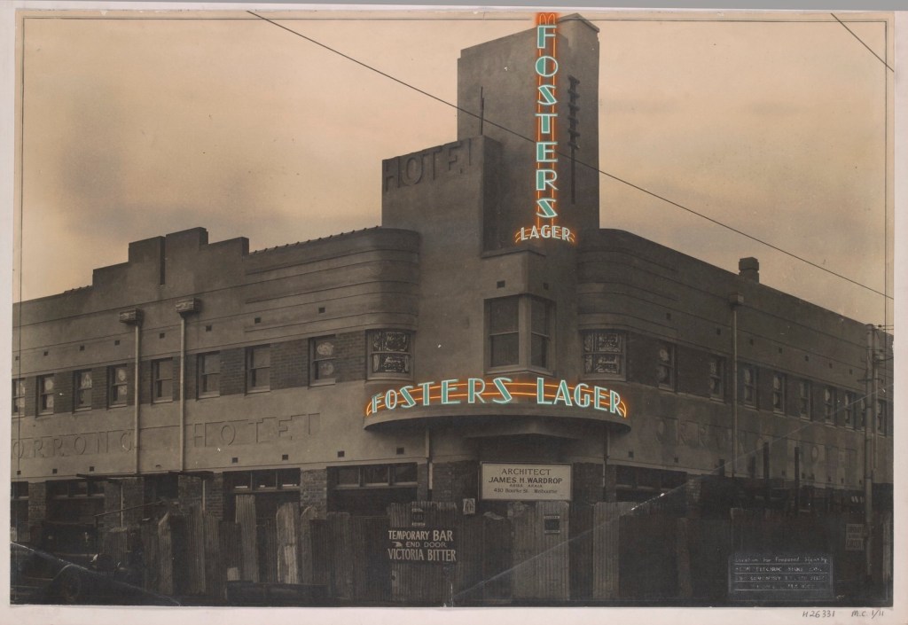The Orrong Hotel is one of the more striking Art Deco pubs in Melbourne, with that stepped corner tower. And the Fosters neon sign is original! Always thought maybe 80s Deco-revival, but no it’s 1939. It’s mostly intact, but at some point the bricks and speed lines and ‘hotel’ sign were rendered over, then later someone painted a vaguely deco line across the top and deco-ish signs. Wouldn’t take much to properly restore. Which they did a bit inside in 2020-21, revealing the corner bar plaster cornices and keeping the bar itself, which is also clearly original – very rare ! A bit of research, and I found that it was built after April 1939, when JH Wardrop was noted as the architect. He’s best known as one of the Shrine architects, but also did the United Kingdom Hotel in Clifton Hill (now McDonald’s), and both hotels are very much inspired by 1930s NSW pubs, much more extensively rebuilt in the 30s than here. Thanks to @chrismbr for the exterior photos, old ones are from the @library_vic. The coloured sign one appears to be a proposal, and seems the vertical one not built. Bar image from the internet.