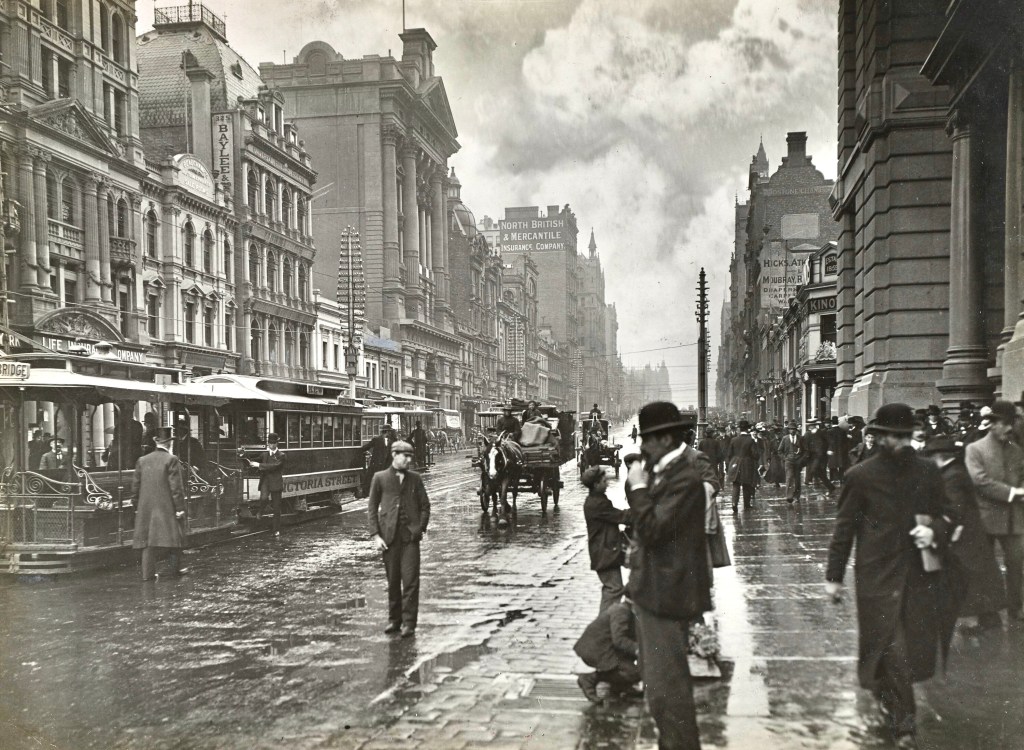 Fantastic action shot of Collins Street from 1900-1910, looking west from Elizabeth Street, in the wet. This happens to be the one block where everything is gone, except the domed banking chamber interior behind the huge classical facade in the centre, and the ex-National Mutual building with spire in the distance on the corner of Queen Street. The Equitable Builfing on the right is finished, so it’s after 1896, and Collins House (dem in the 70s) built in 1910 a bit further along isn’t there yet. Photo is from @ngvmelbourne, attributed to FRITZ KRICHELDORFF, who seems to have taken many views of Melbourne between 1900-1910 for the then booming picture postcard industry; this is one of the few original photos of his it seems.