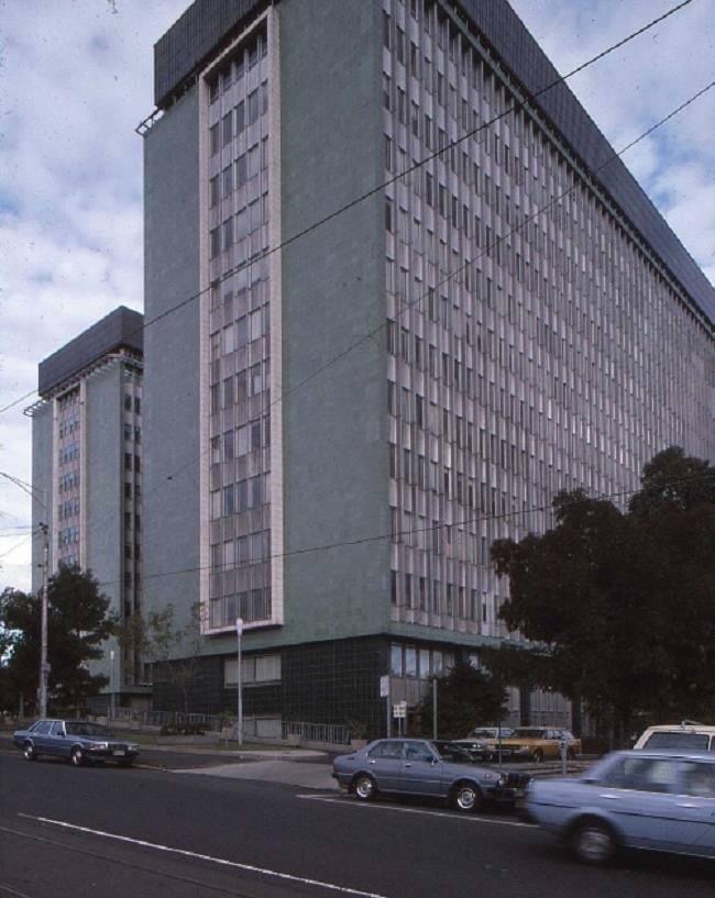So who remembers the ‘Green Latrine’ ? Perhaps few of you, since this huge unloved modernist government building on the Spring Street / Latobe Street corner opposite the Carlton Gardens was demolished in the late 1980s.
