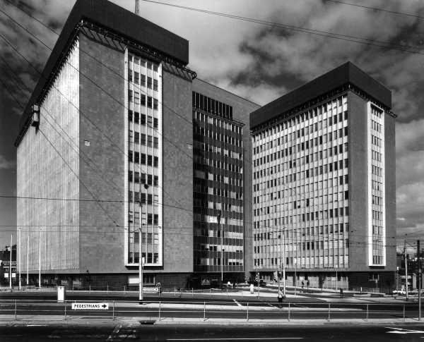 It was notable for its great scale and early date, the first stage finished in October 1958, a month before its more elegant cousin, the height-limit busting ICI Building. By contrast, the Commonwealth Centre stopped at the 40m height limit, and was more conservative in design, though still way ahead of many others at the time. It was also notable for being designed by Cynthia Teague, one of the rare senior female architects at the time. Though quite stylish, it was also quite massive, over two joined blocks (the second built 1966, with three more planned), It was full of public servants, and most unexciting of all, the end walls were clad in pale green ceramic tiles, the colour seen in government buildings and bathrooms; the probable source of the name (plus it’s a great alliteration). Though unloved, it was better than the agglomeration of vaguely postmodern apartment blocks that finally filled the empty site in the late 1990s.